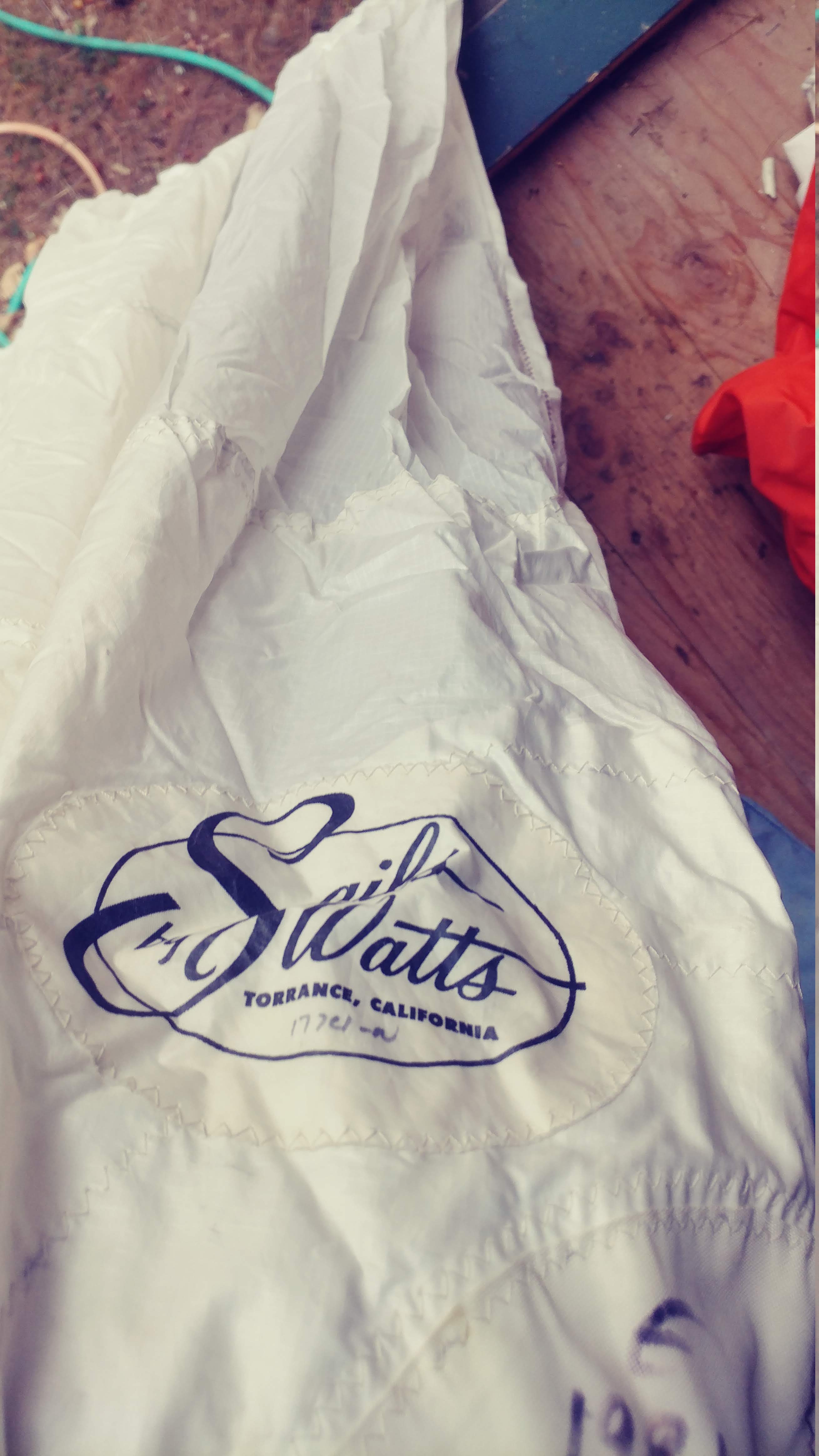 Old spinnaker, 1980. Can't really see how blown out this chute is, but I would expect it's certainly beyond competition days. Might be good for practicing put-ups and take-downs, without risking your good chute. Or a cruisin' chute.