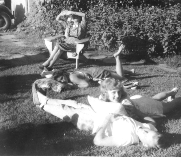 01/14/2013: Keith Simpson: Lucy P. Brown in background, Nancy in foreground with unidentified friends. This is on the road side of the cottage at Lake St. Catherine. In the afternoons that's where the sun would be.