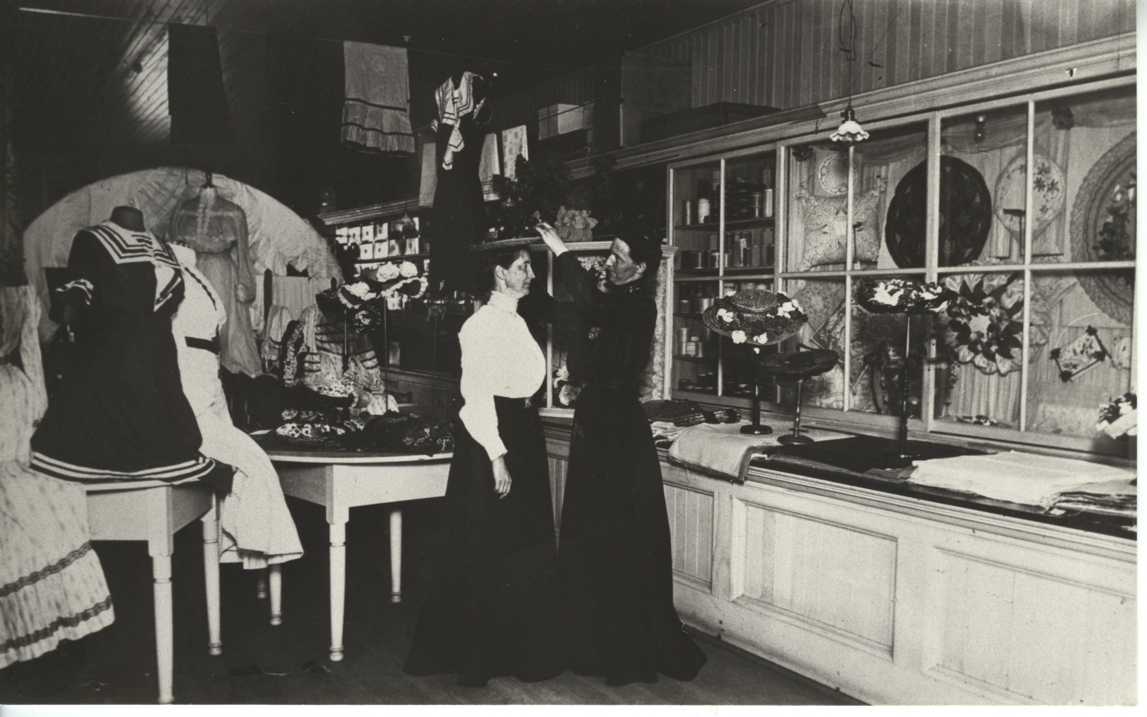 Hat and Clothing Store, owned by Myra R. Beacham, c. 1900. Located on North Main St., lake side, second store west of the bridge.