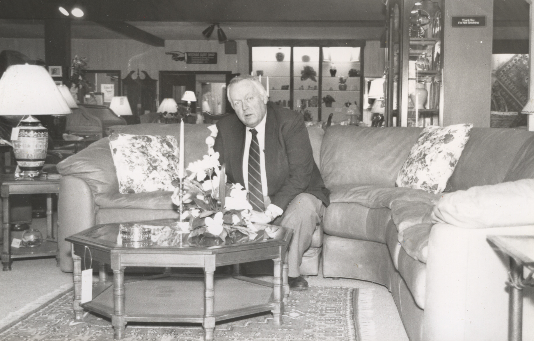 Parson's Furniture, with proprietor Pat Cullinan, shown in the firm's large showroom on Center St. near the junction with Gov. Wentworth Hwy, 1994. The store is now Wayside Furniture.