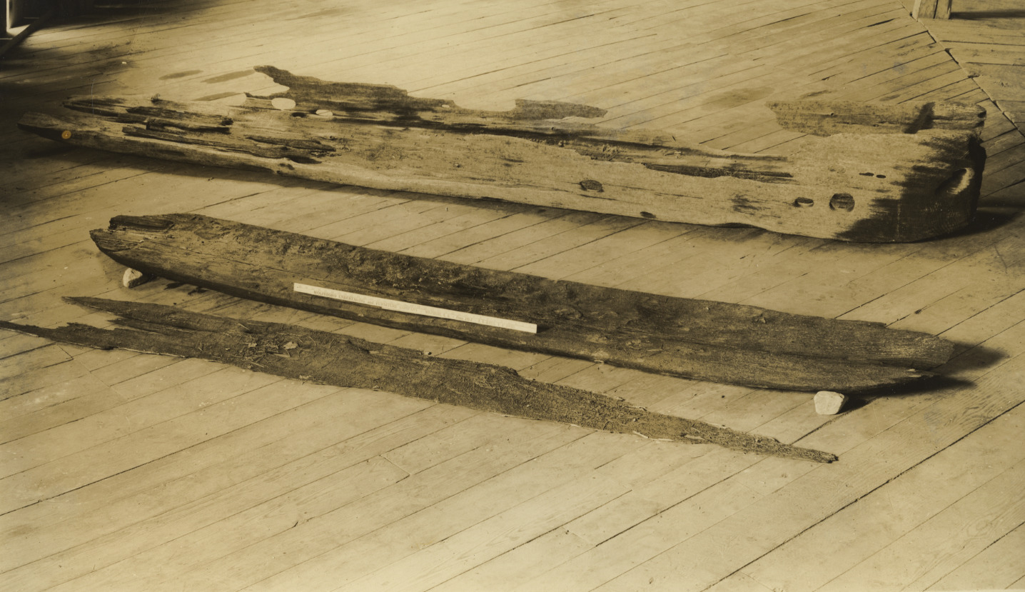 Indian dugouts discovered at Hill Camp on Rust Pond, July 13, 1955, in 20' of water (the level 200 years ago was at least 10' lower than today) and about 90' off shore. The dugout size was about 14' long, 2' wide, 18" freeboard. The front remnants were not buried deeply on the lake bottom, and years of winter ice action planed off the sides. The rear dugout was deeper and less affected. Both were sunk with rocks, to keep them hidden for later use. They are now on exhibit in the Libby Museum.