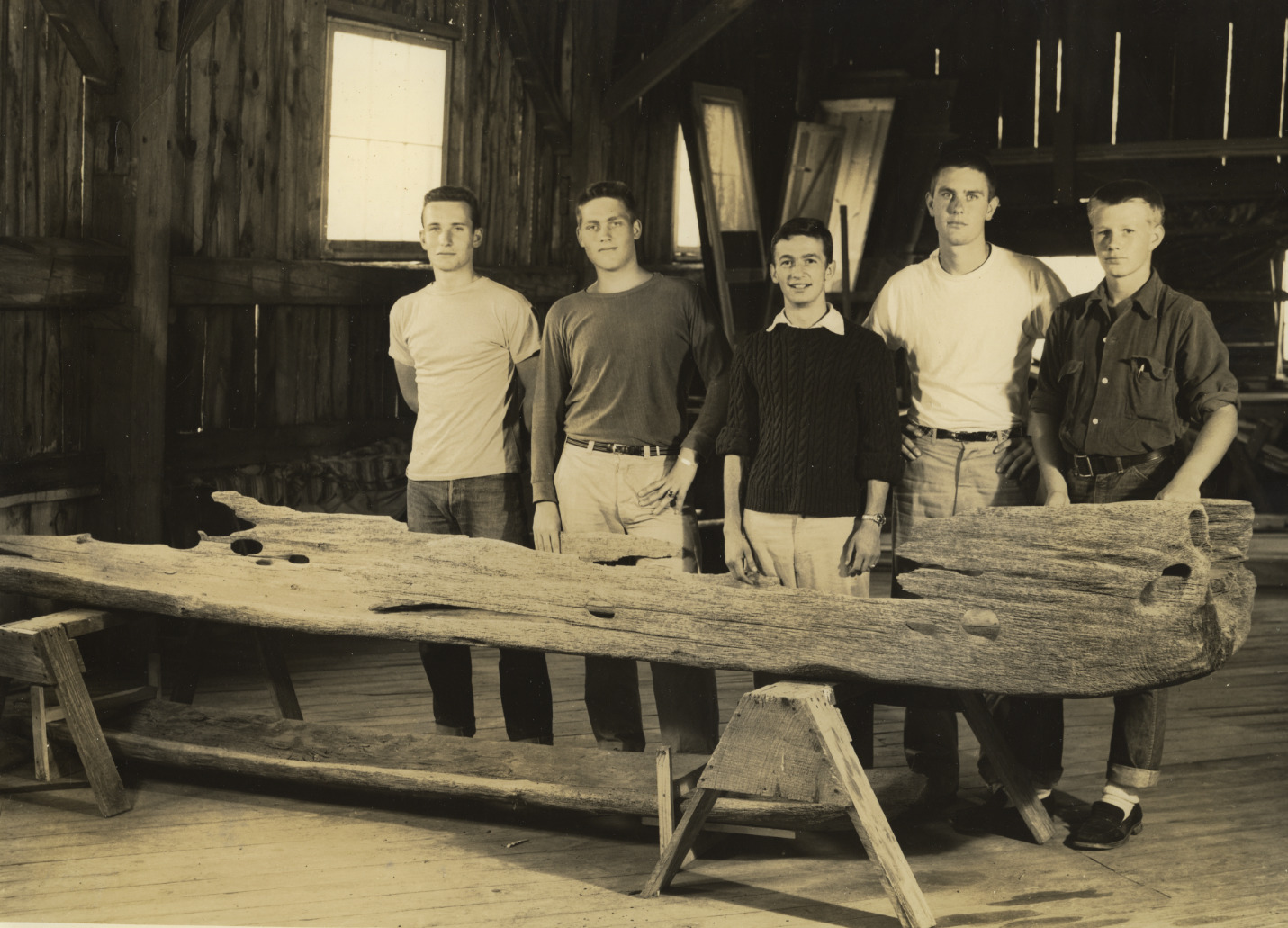 Indian dugouts discovered at Hill Camp on Rust Pond, July 13, 1955, drying out in the Camp barn. The boys who discovered the dugouts are, L-R, Richard Mercier-Cointreau, Norman Willock, Ben Rose, Clark Mercier and James Berry.