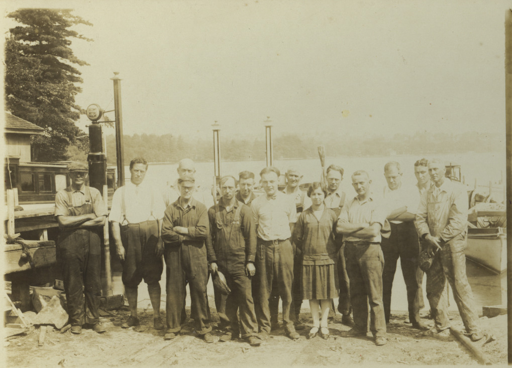 Goodhue & Hawkins Navy Yard on Sewall Road. The crew in the early days of the firm; the only identified people are the woman, Miss Louise Glidden, and the third man from the right, Chester Hawkins. The pump on the left dispensed Socony Motor Gasoline.
