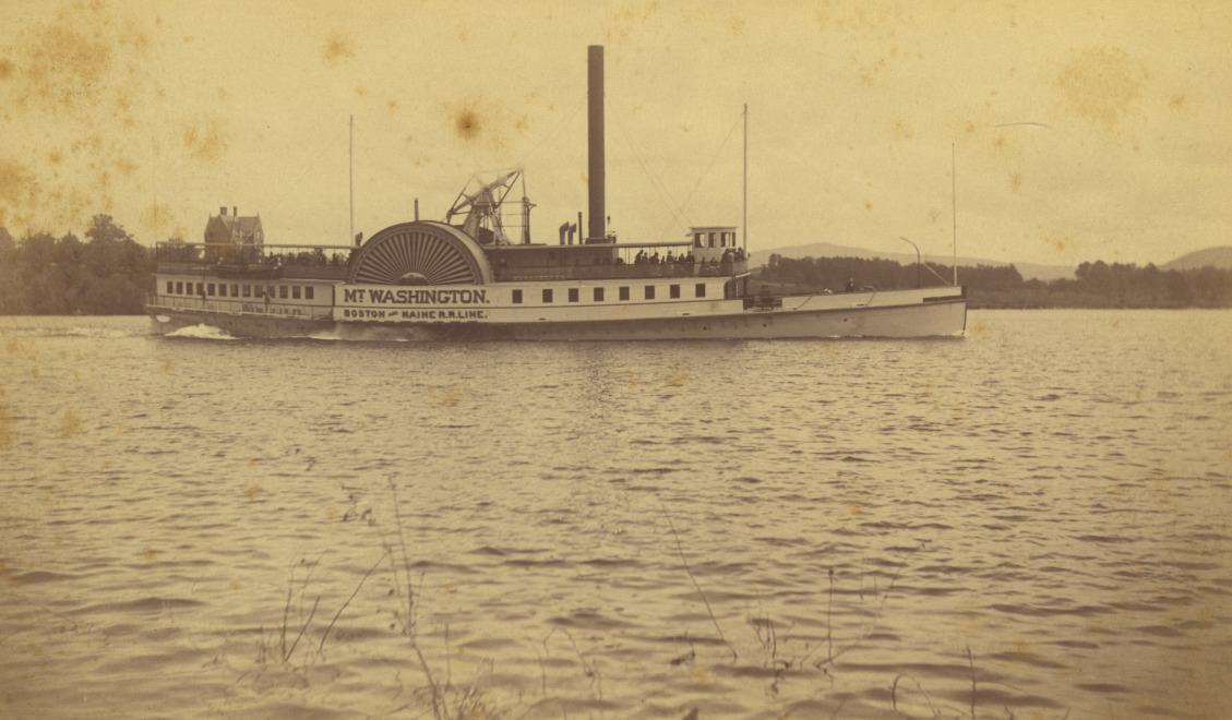 The 1872 Mt. Washington in Wolfeboro Bay. Brewster Free Academy and campus in background.