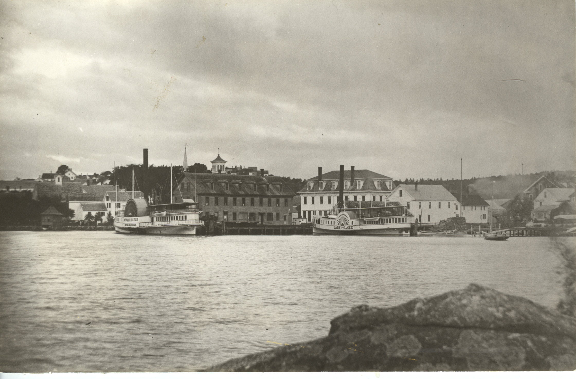 The 1872 Mt. Washington (left) and Lady of the Lake (right) at Wolfeboro Landing, taken before 1890 (Brewster Memorial Hall not in photo). The large building to the right of the Mt. Washington is the Boston & Maine Railroad Wharf Building, to the right of it is the Goodwin Block. The smokestack on the left is from the Joseph Varney Tannery.