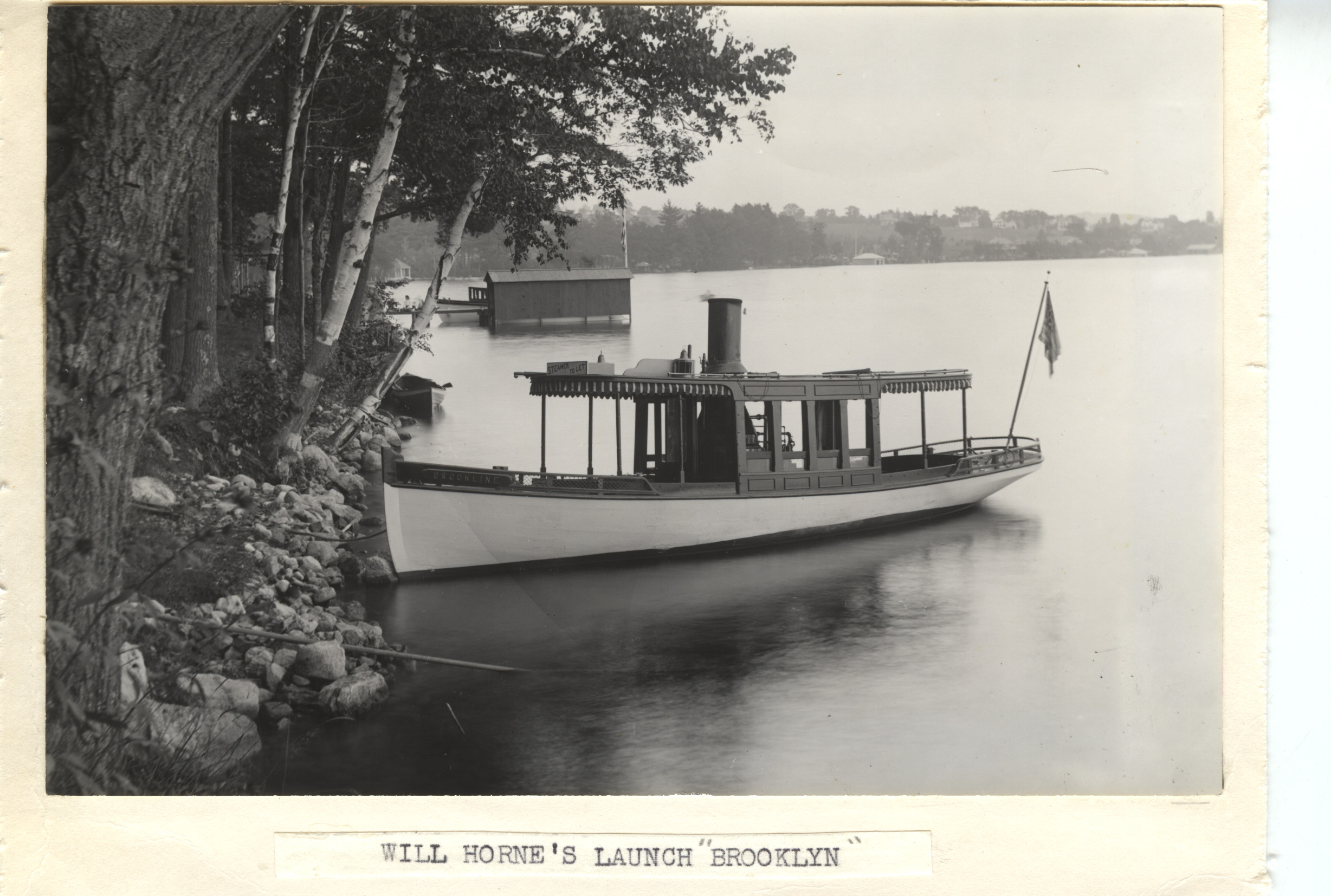The Brookline (not Brooklyn) was a small open-deck steamer with a canopy top based in South Wolfeboro and was frequently used for excursions from about 1898, with 15 to 20 passengers. Business included Camp Kehonka girls, fishing parties and odd jobs such as towing rafts of logs to Clow's Sawmill. The sign above the canopy says "Steamer to Let". By 1918, the power system had been convered to gasoline.