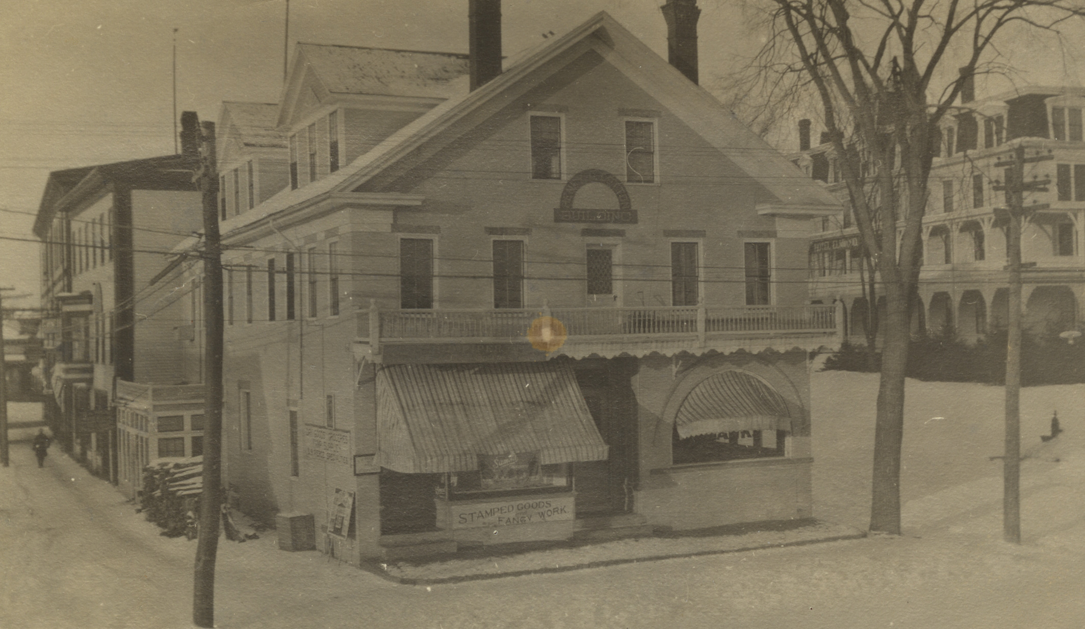 The Bank Building after 1907. Henry D. Cotton bought the building in 1905, added the balcony in 1907, and added his name above the second floor. The Wolfeboro National Bank is on the right. Charles H. Hersey's Store is on the left, selling groceries, dry goods & clothing; at his death in 1910, he was the longest resident businessman in town, having a store at this location for 48 years. The Glendon House, now called Hobbs-Is-Inn, is on the right.