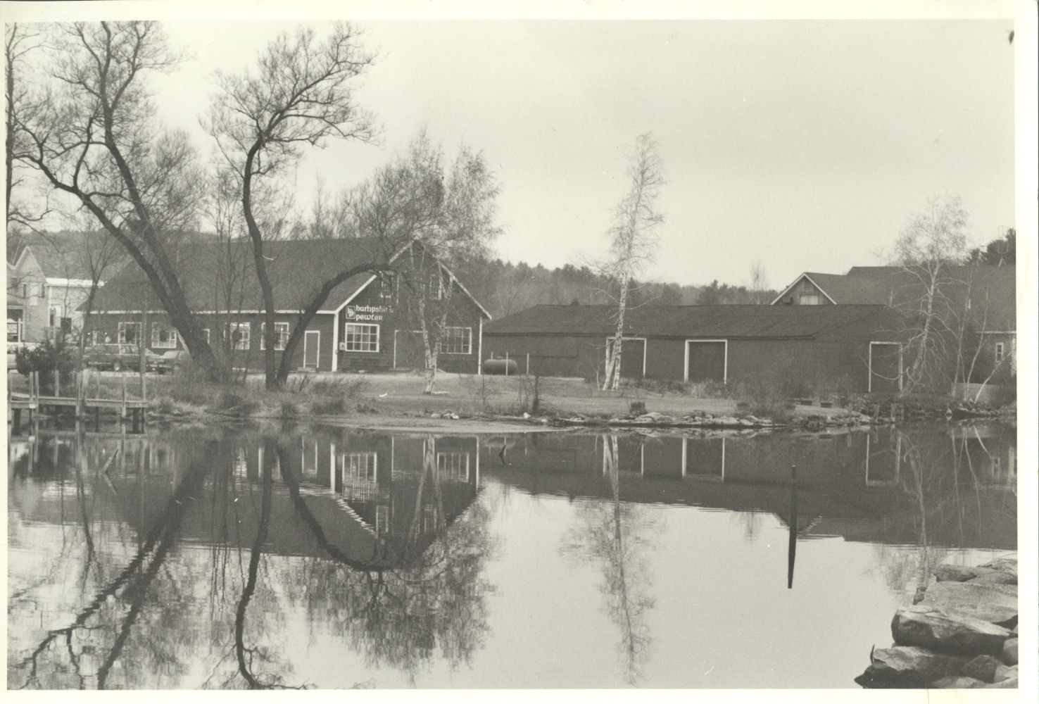 This is the Hampshire Pewter Factory and Showroom on Mill St. in 1994. This popular business started in 1973 and provided a special ornament each year for the White House Christmas tree on the Elipse. The factory was at this location until about 2013. The building is now the Calvary Church. The photo was taken from the docks on Railroad Ave., with the still waters of Back Bay providing good reflections.