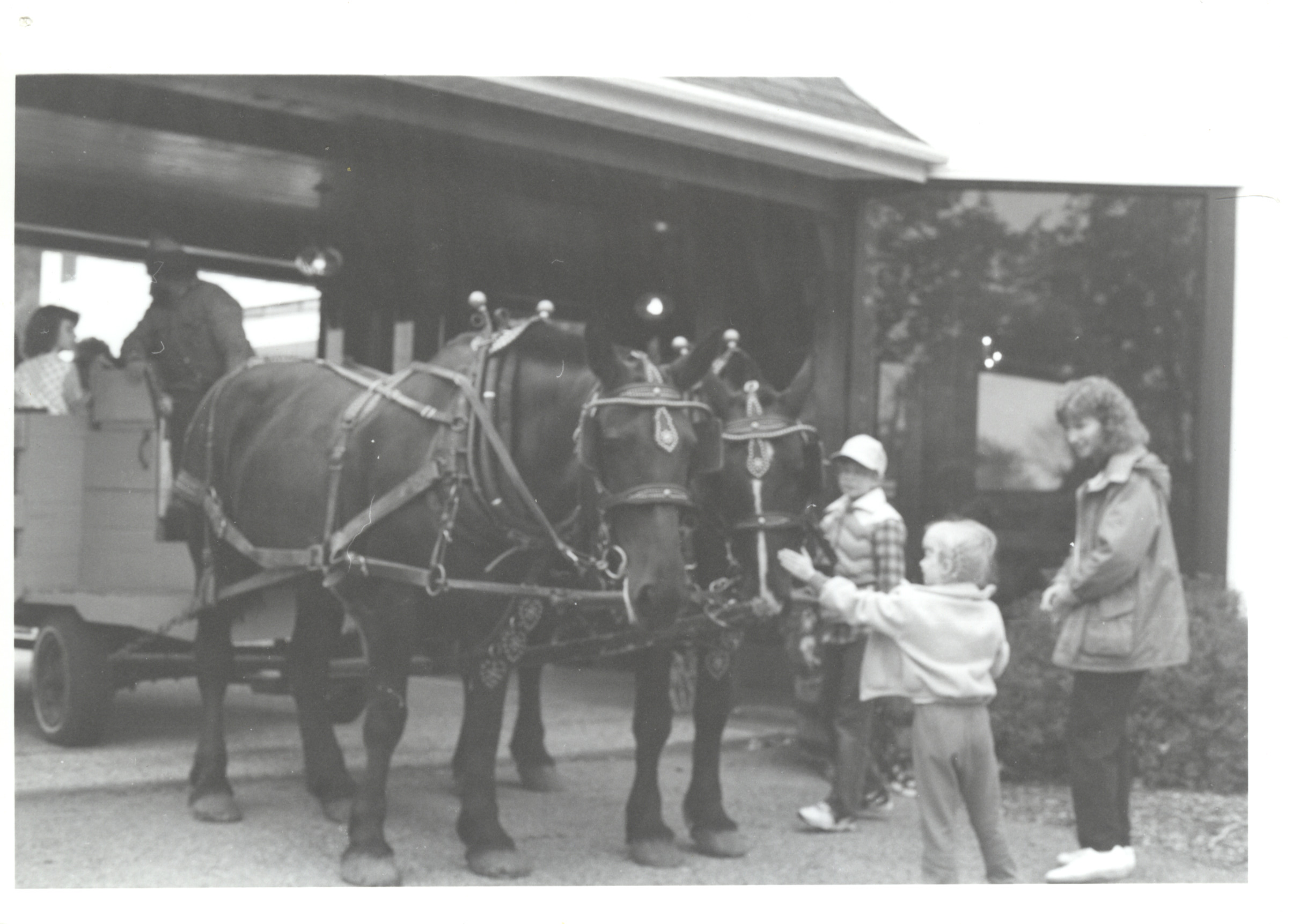 Draft horses are set to haul visitors on a ride, as part of an Octoberfest event, c. 1990. The scene is at the entrance to the Wolfeboro Inn on North Main St.