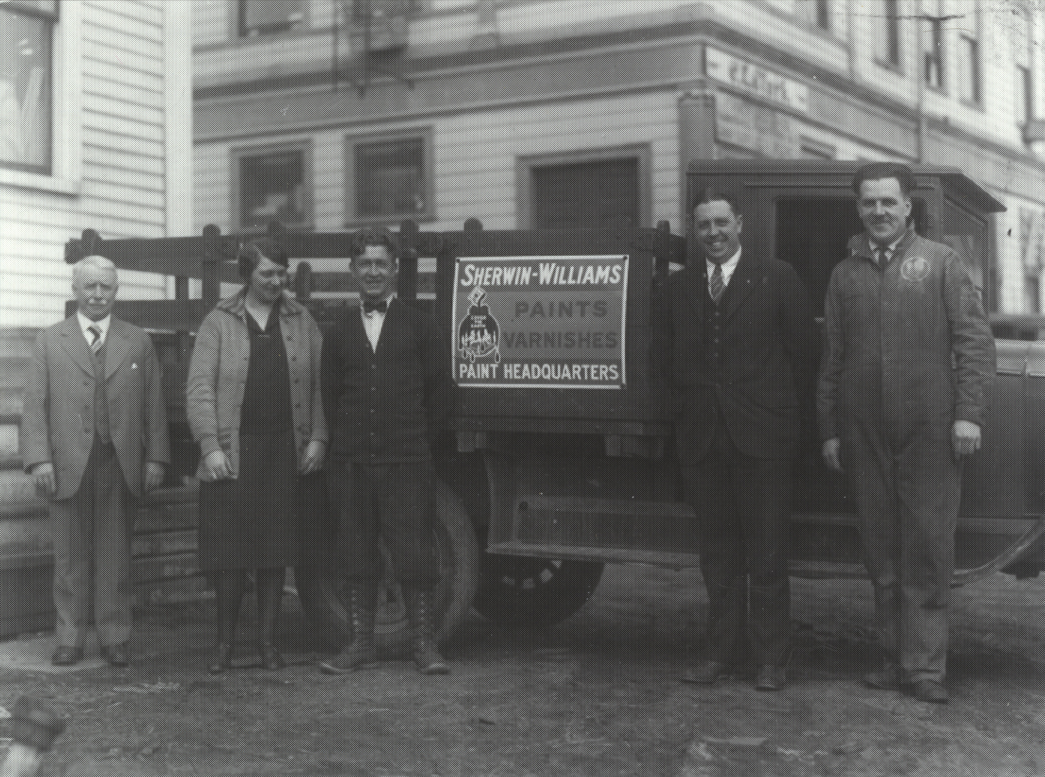 Staff of H. H. Wallace Hardware Store, 1916. Store was in the Goodwin Block on South Main St., on the lake side next to the bridge. Photo was taken behind the store, at dockside, with the Peavey Block, now Avery Block, in the background. L-R, owner Hugh H. Wallace, bookkeeper Gladys Cole Smith, Ernest Jones, Clayton M. Wallace (Hugh's son) and an unknown man.