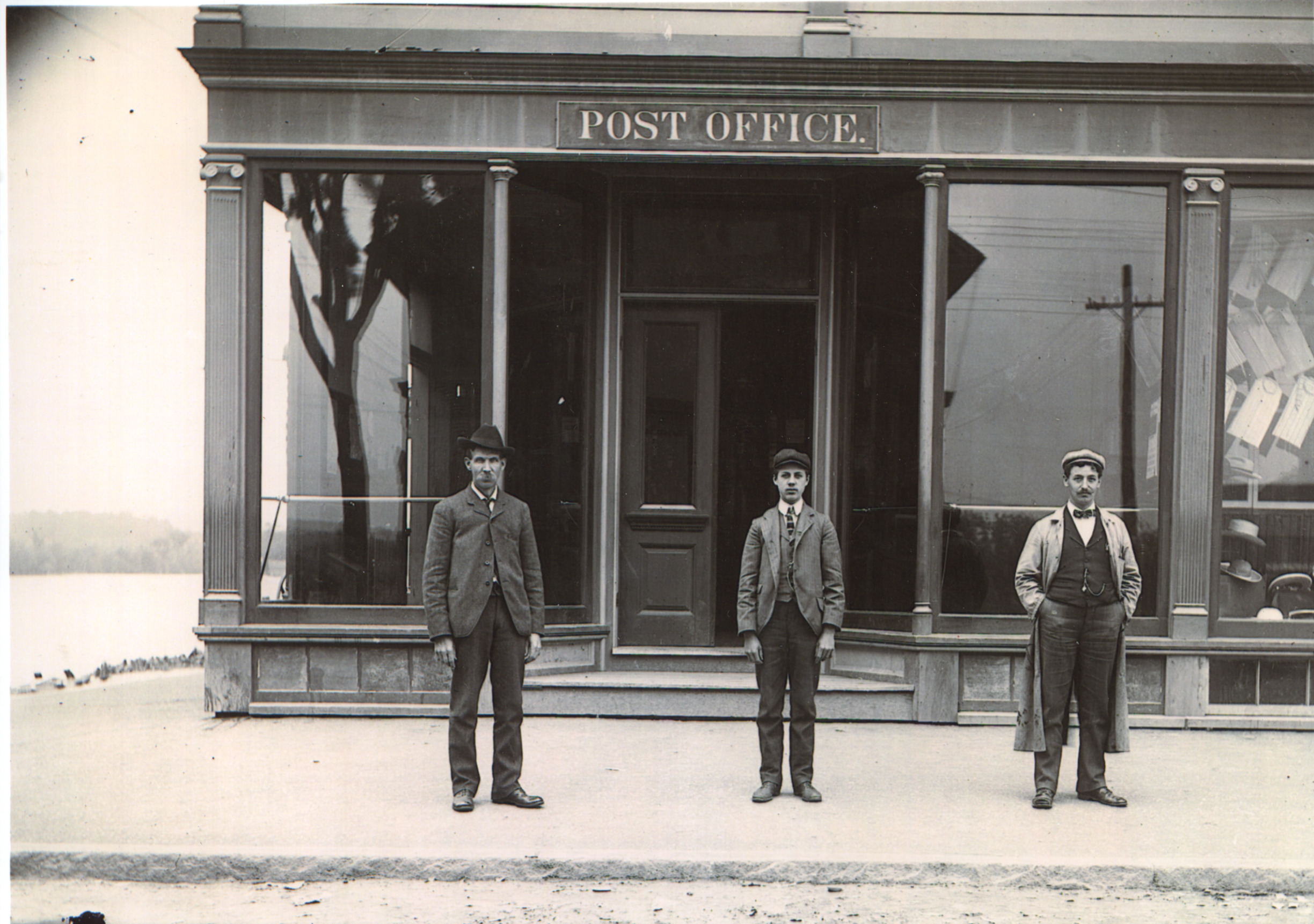 The Wolfeboro Post Office was established in 1815, but didn't begin operations until 1820. The first location was on South Main St. in the Goodwin Block. This photo is the third location, on South Main St. in the Peavey Block, c. 1907 (moved from Railroad Ave. in 1894). The store on the right is the Frank L. Ham Clothing Store. This Post Office location is now the Avery Insurance Co. The postal workers, L-R, are Postmaster Forrest W. Peavey, Harry P. Corliss, and Assistant Postmaster Arthur H. Copps (who became Postmaster in 1909).