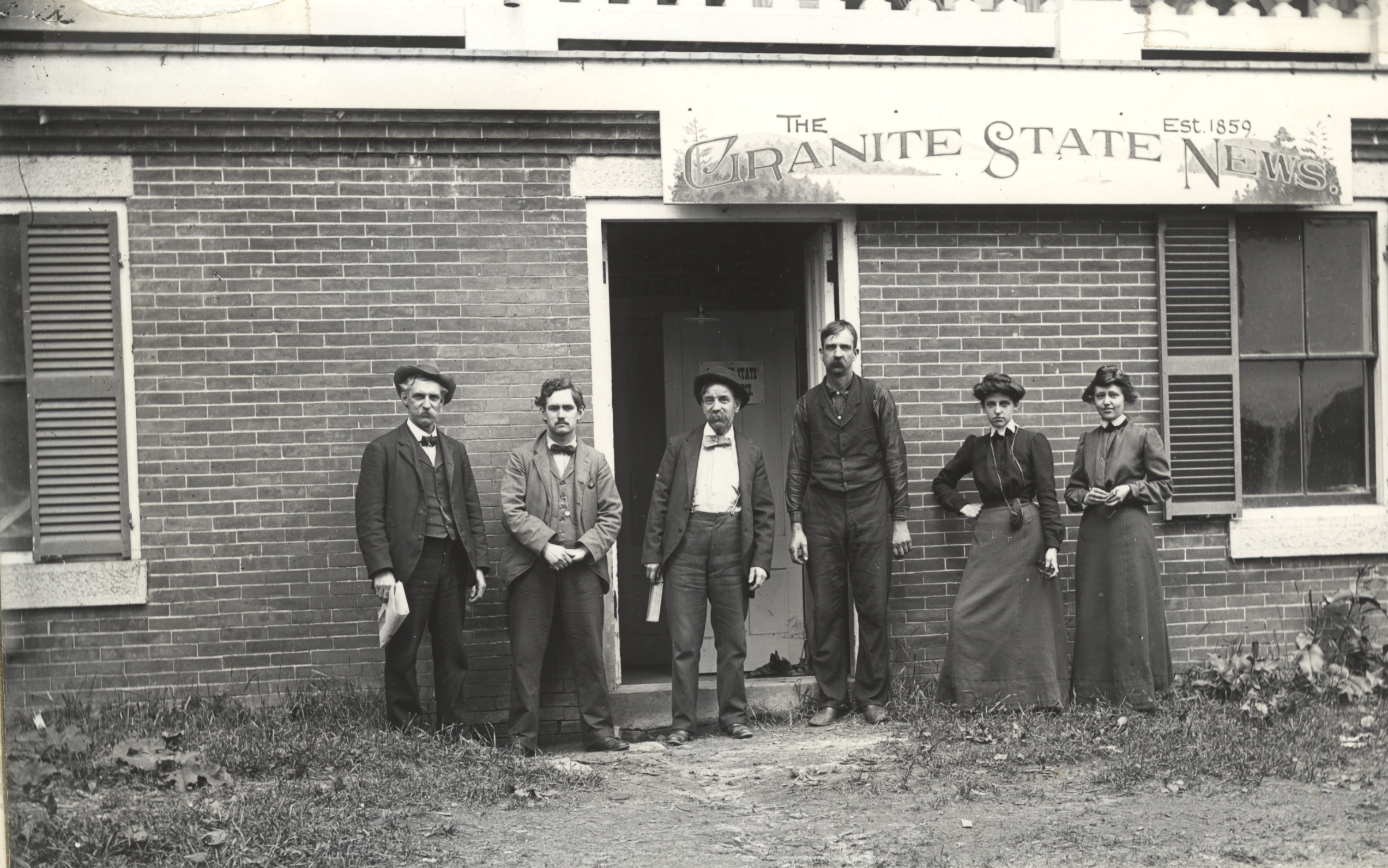 The Granite State News began in 1860 and had many locations. This June 20, 1903 photo is their office in the street level of the Durgin Block on North Main St. The staff is, L-R, Editor Frederick W. Prindle, Parry T. Hersey, Charles H. Warren, Herbert J. Horne, Clara Sawyer Sanborn, and Lydia E. Sawyer.