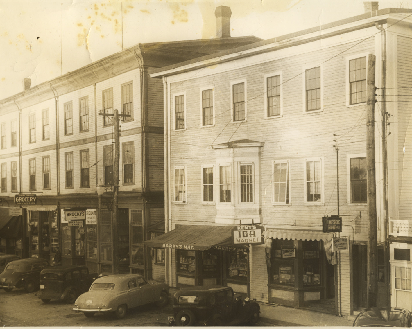 These buildings are on Railroad Ave. behind the Bank Block, March 12, 1951. On the left building are signs for Jerry L. Thayer, attorney; Wm. Britton Insurance Agency; Gray Brothers Grocery & delicatessen; & Brocky's Appliances (which also offered bus tickets and a taxi stop). The building on the right housed; Barry's Market (Kent's IGA Market, successor; both names were used simultaneously); Walter Thompson's shoe repair; Lake Shore Garage; and Bennet & Berry accountants. The left building burned down on Jan. 1, 1958 and was rebuilt.