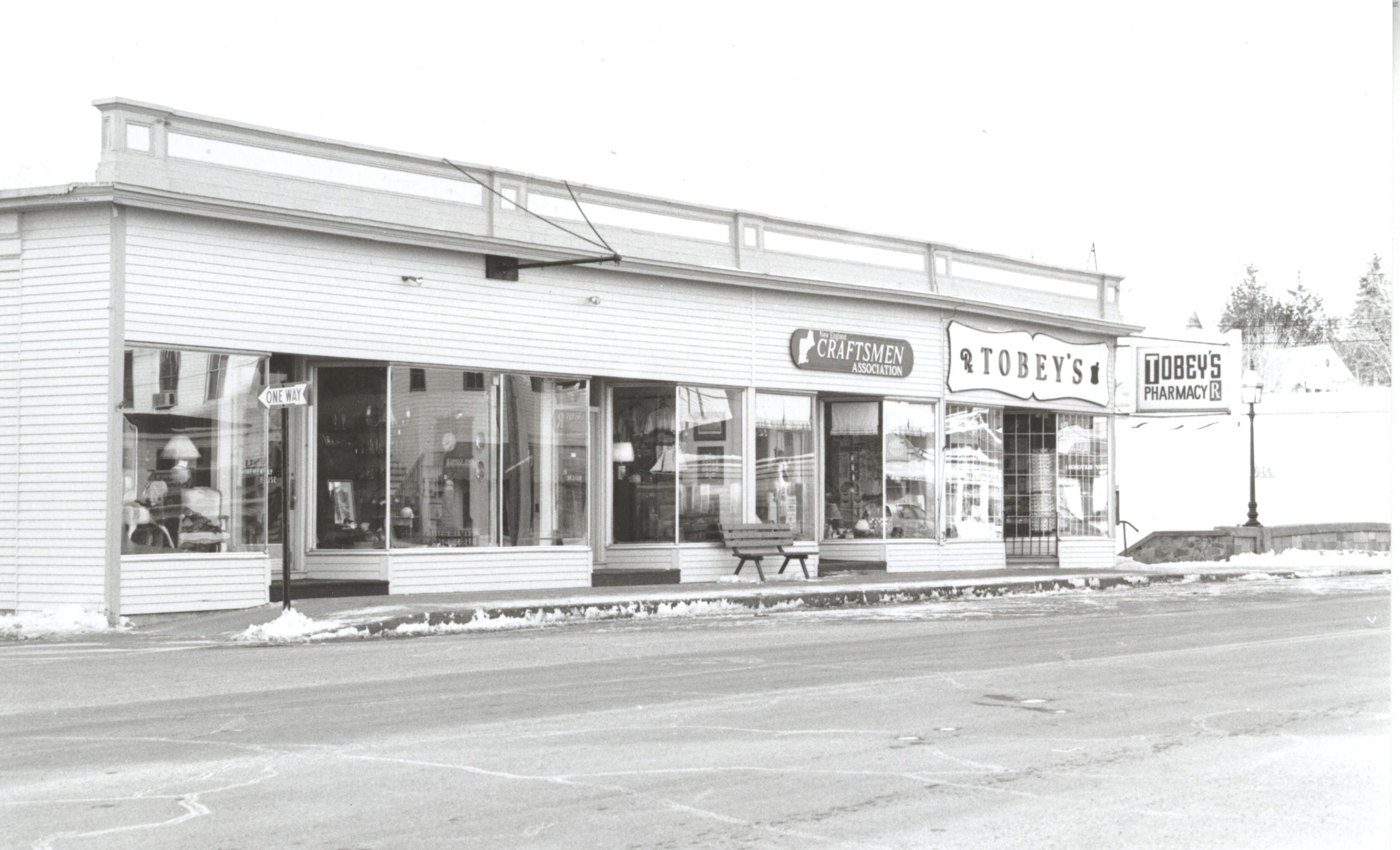 The Goodwin Block on South Main St. between the Avery Block and the bridge has had a checkered history. Originally built as an elegant 3-story mansard design in the 1860's, it was destroyed by a massive fire in 1899, then quickly replaced by a simple 1-story building. That building was destroyed by fire on Oct. 13, 1908 and rebuilt by J. Frank Goodwin in early 1909. This 1993 photo shows the occupants, L-R; Hemenway House, gifts and furniture; New England Craftsmen Association; and Tobey's Pharmacy, an original tenant in 1909. Today, the businesses are Wolfeboro Casuals and Emma Taylor, both clothing stores.