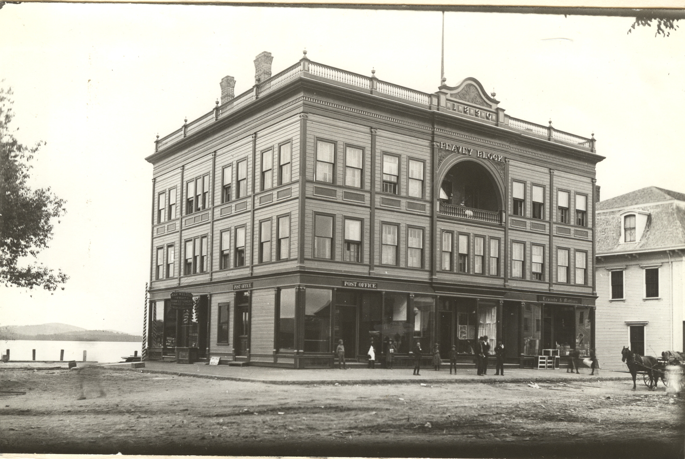 The Peavey Block on South Main St. (now known as the Avery Block) was built in 1889-1890. The 1890 date is on the top of the elaborate facade. This is an early 1890's photo. The Post Office is at the lower left corner, with the James Welton fruit & confectionery store behind it. The center front seems to be unoccupied. At the lower right is the Lewando & Mattison grocery & general store. The two upper floors held offices and apartments. The building on the right is the 3-story Goodwin Block, which burned down in 1899.