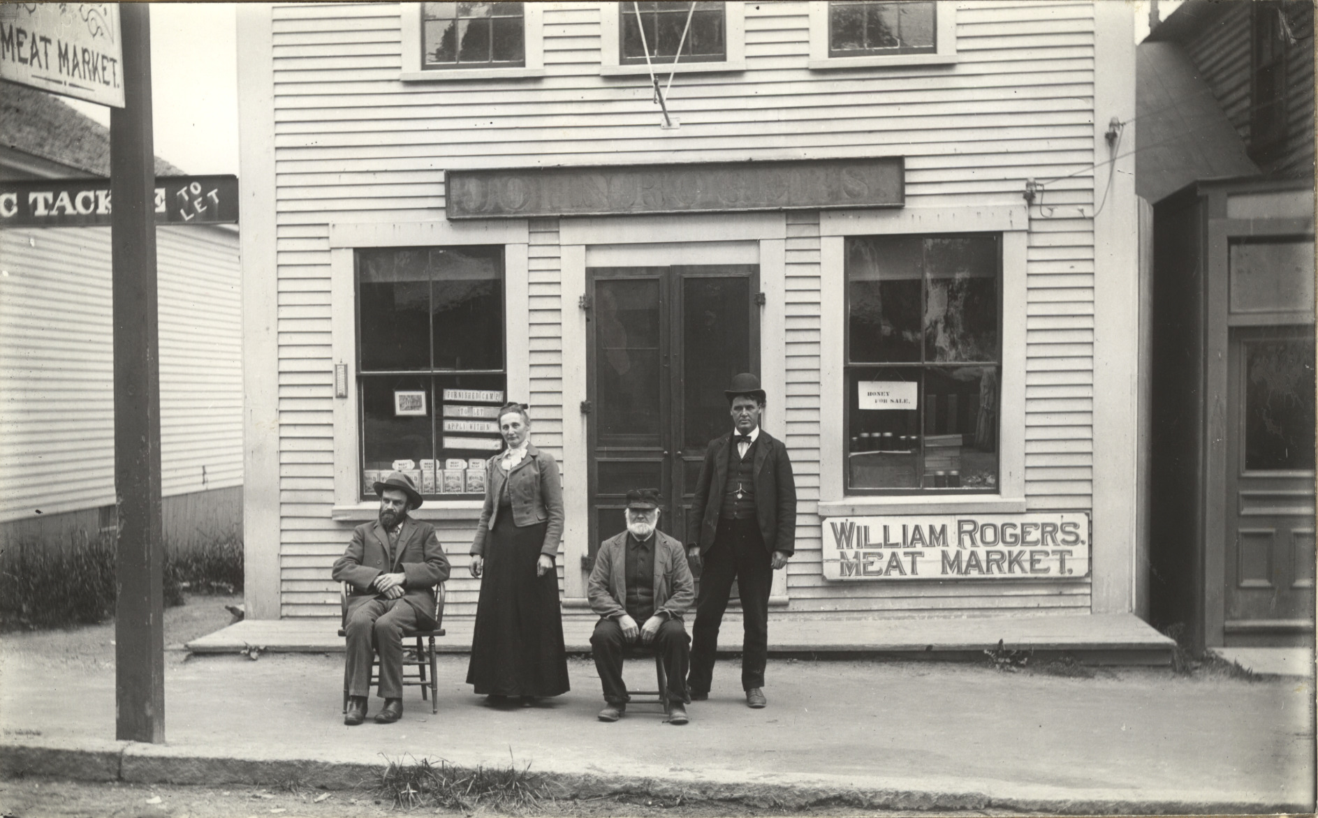 William Rogers Meat Market was on South Main St. on the lake side of the street, June 1903. The faded sign above reads "John Rogers", a former occupant as a shoemaker, boot & shoe dealer. At one time, this store was the licensed town depot for the sale of bottled alcoholic beverages. The site was later Hall's Pharmacy for many years, located between the Avery Block and Town & Cate Parks.