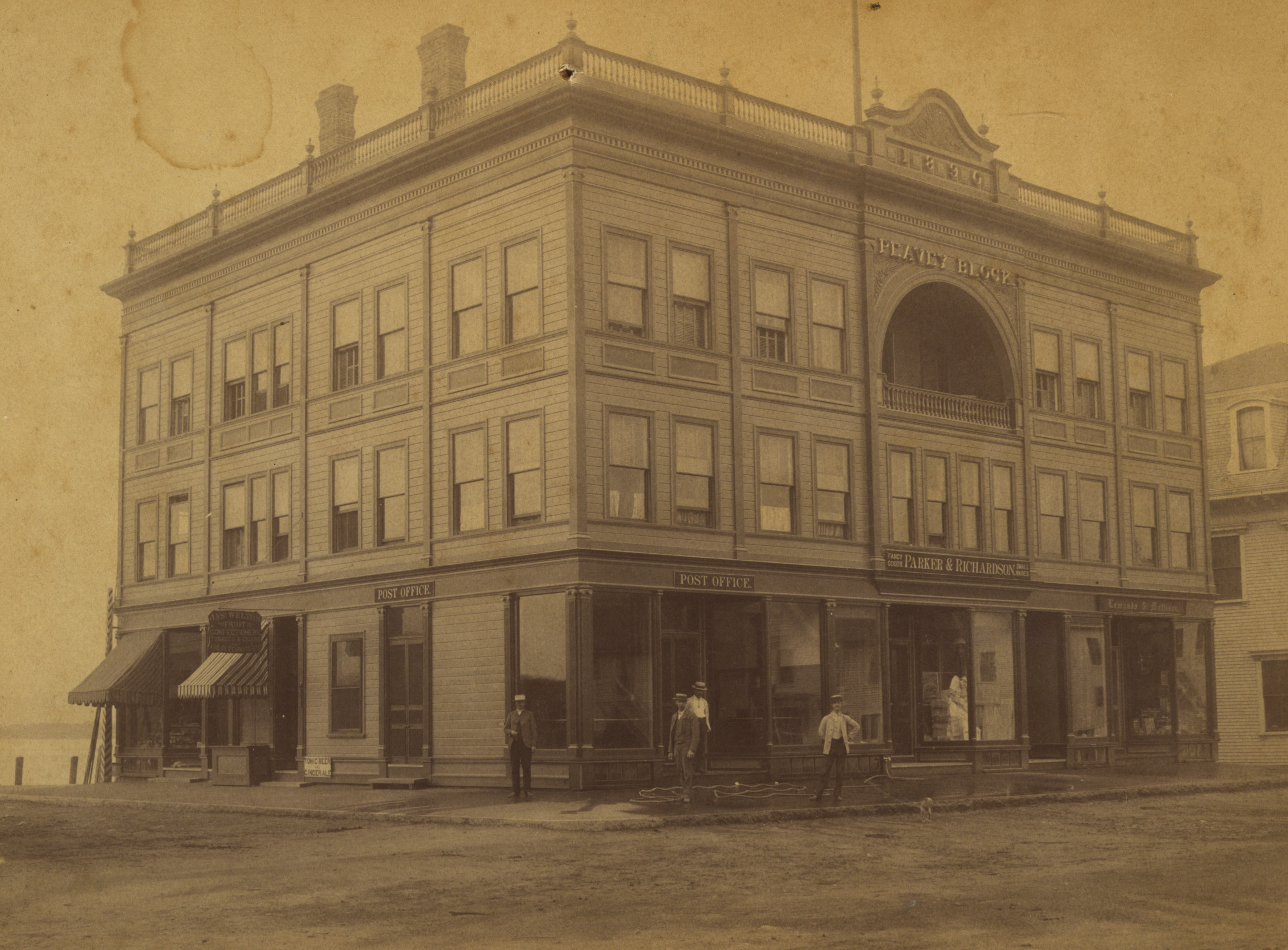 The Peavey Block on South Main St. (now known as the Avery Block) was built in 1889-1890. The 1890 date is on the top of the elaborate facade. This is an early 1890's photo. The Post Office is at the lower left corner, with the James Welton fruit & confectionery store behind it. The center store is the Parker & Richardson dry goods store. The Lewando & Mattison grocery & hardware store is on the right. The two upper floors held offices and apartments. The building on the right is the 3-story Goodwin Block, which burned down in 1899. The man in the grey suit in front of the Post Office is John L. Peavey, building developer. On the right with a small dog on a leash is Joseph Lewando.