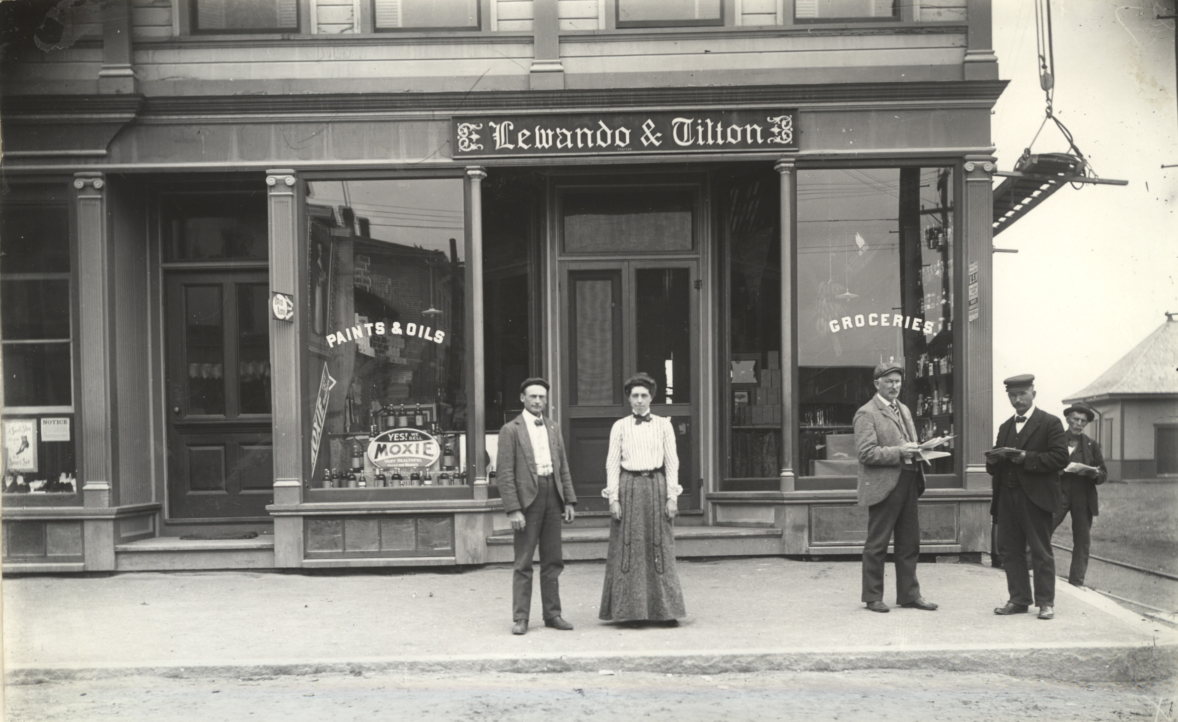Lewando & Tilton grocery & hardware store, June 1903. Founded in 1899, Joseph Lewando and Wilbur J. Tilton operated under this name until 1922, located in the right corner of the Peavey Block (now Avery Block) on South Main St. The site had previously been the Lewando & Mattison store. The left window has a large display of Moxie bottles, remember those? In 1905, the business began deliveries to Lake Winnipesaukee islands and shorefront cottages using their own boat, aptly named "Grocer".