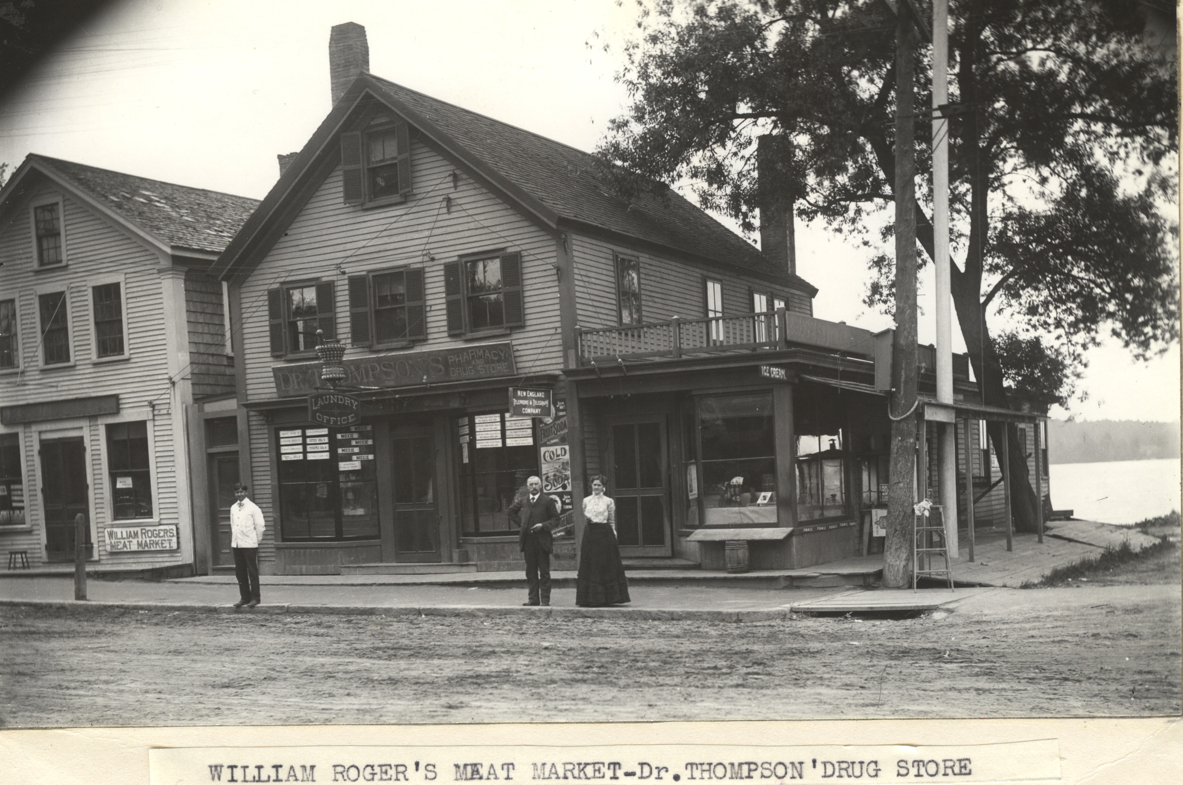 South Main St. buildings across from today's Post Office in June 1903. Left is William Roger's Meat Market, center is Dr. Thompson's Pharmacy, and the small building on the right is Kalloch's Confectionery & Ice Cream Parlor, which was also the office of the New England Telephone & Telegraph Co. The Pharmacy mortar & pestle above the Pharmacy door was illuminated. Signs in the window advertised soda and Moxie (5 signs show it was quite popular). On the right is the Town Liberty Pole, a prominent landmark for many years. Over 100 feet tall, the pole was a gathering spot for speeches and special announcements. The Pharmacy, considerable remodeled, is now the Downtown Grill. The corner was rebuilt as a new 2-story structure in 1994.