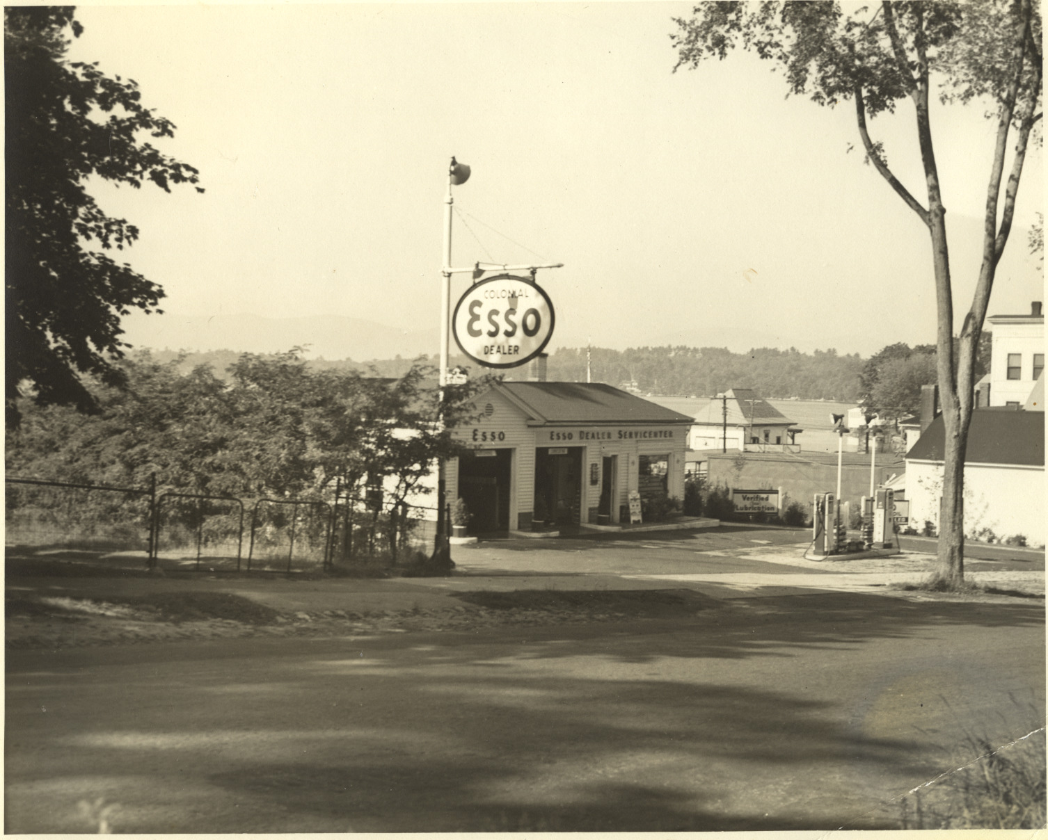 This Esso Gas Station on South Main St. was built in 1941 when the Ann Inn was removed. The Station was there until 1966, when it was torn down, and the site eventually became Town & Cate Parks. The Dockside restaurant, formerly the Railroad station, and Wolfeboro Bay are in the background. The gas station building was saved and moved to an area off Factory St., near the present Foss Field, and used as a warming hut for an outdoor town skating rink.