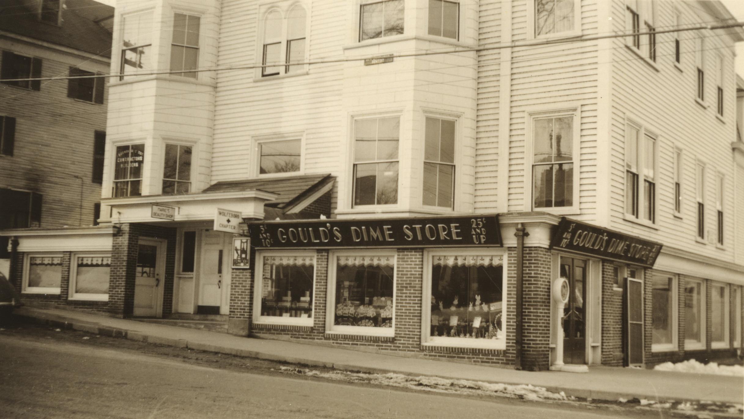 The Durgin Block on North Main St. with Gould's Dime Store on the ground floor corner, Jesse and Dorothy Gould opened there in 1937 and used the name until 1967. This photo is c. 1940's. Marie's Beauty Shop is the store on the left. Goodwin & Doe, Contractors & Builders, have an office on the second floor. On the left is the tall Sheridan House, considered an eyesore in its later years and torn down in 1941. That site is now the Wolfeboro Marketplace.