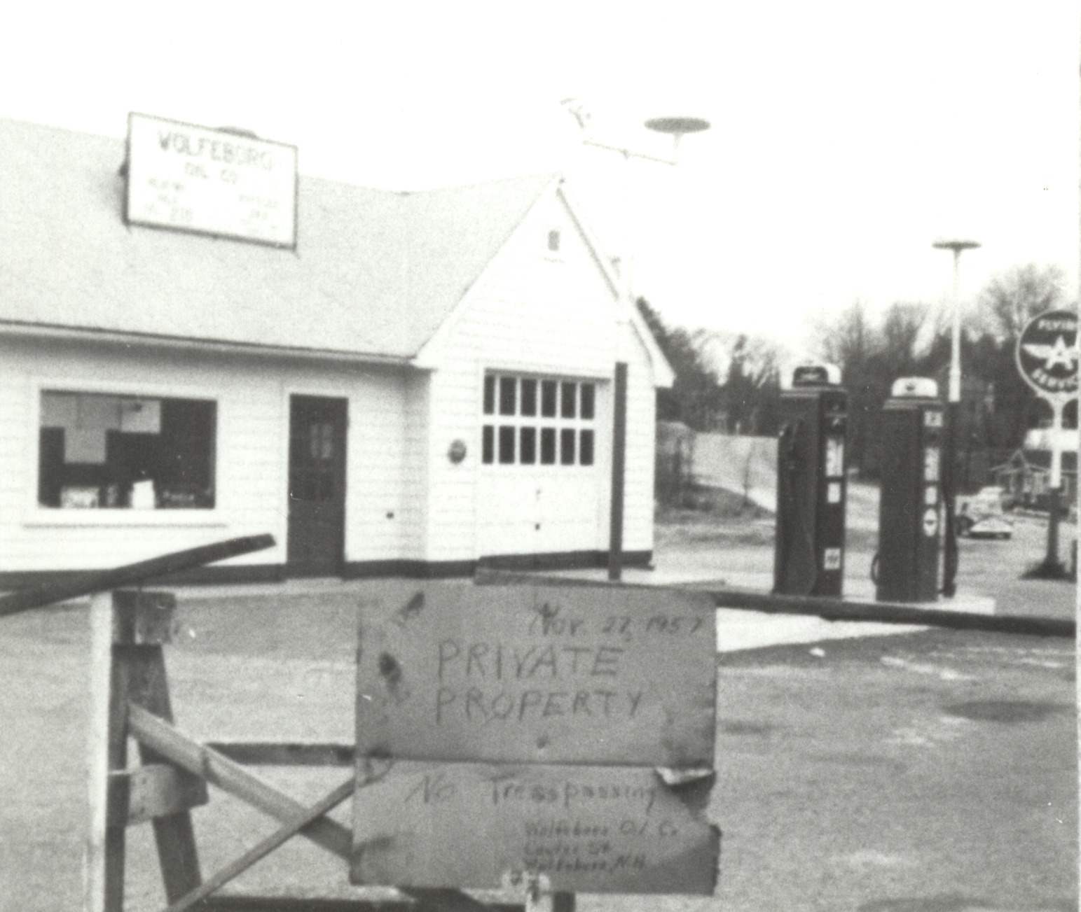 The Wolfeboro Oil Co. and Flying A Gas Station is starting an extensive rebuilding at their facility at the corner of Center St. and Factory St. (now Lehner St.). The sign reads Nov. 27, 1957. The new buildings were opened in 1959.