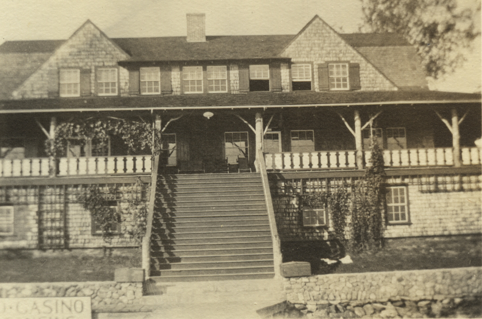 The Kingswood Club House, front side facing the lake, c. 1907, at the end of Endicott St. The Kingswood Club began in 1901 as a social club, mainly summer residents, formed with the intent of improving the Town of Wolfeboro. The goal was to improve tourism, as well as increasing accessibility via better roads and train schedules. In 1907 they purchased the former Varney Tannery property and had the tannery buildings torn down and a new facility erected. The building had a kitchen in the basement; dining room, reception parlor and smoking room on the first floor; and sleeping rooms on the second floor. The building was used later, in the 1910's, by the Kingswood Golf Club. In 1921, it was remodeled and became the Kingswood Casino, a public gaming center. See next photo for later history.