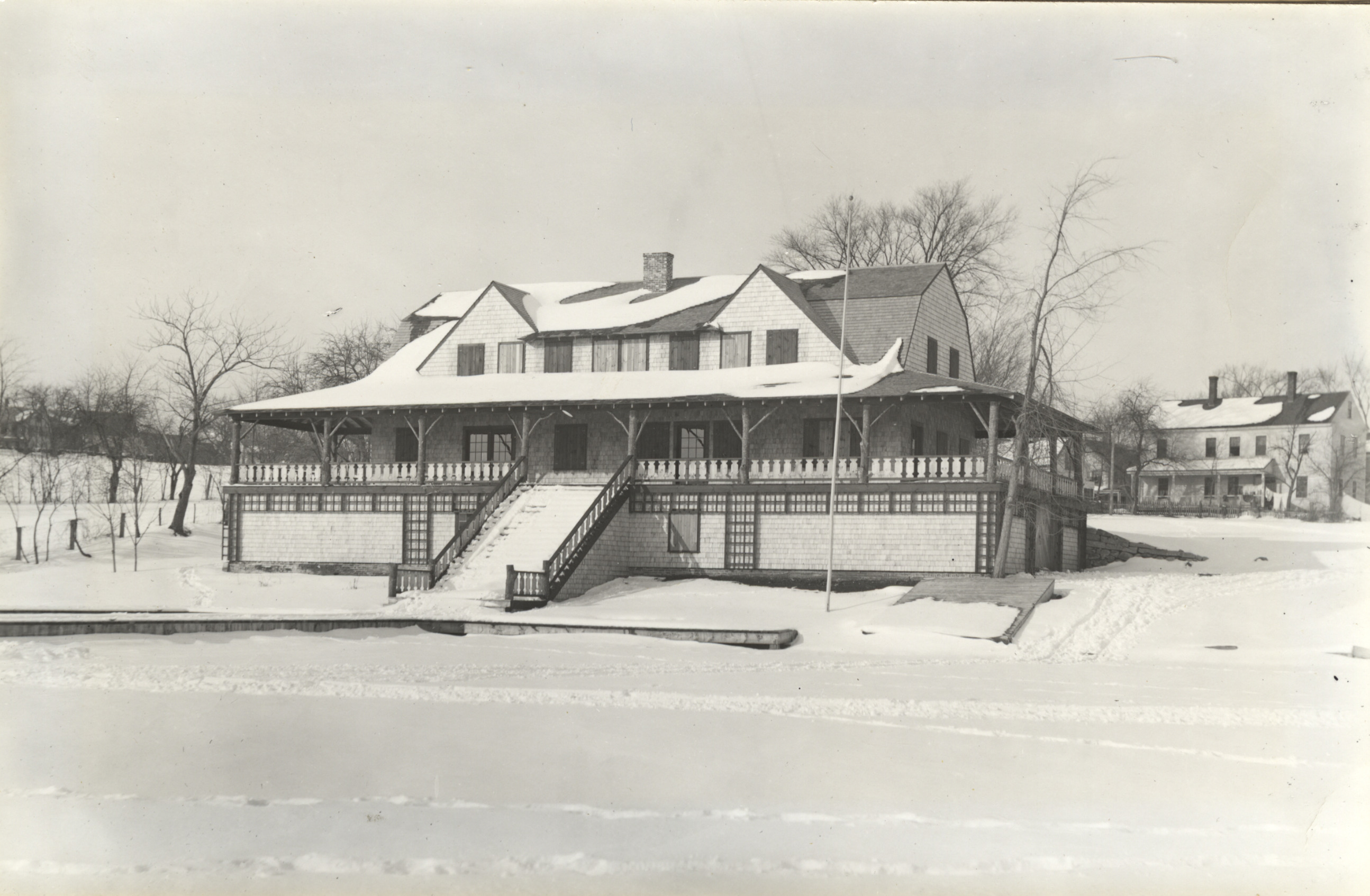 The Wolfeboro Casino in 1921 at the end of Endicott St. was the former Kingswood Club House; see previous photo for earlier history. In 1921, the Casino was an elegant public entertainment business. At various times, there were four bowling alleys, dancing, billiards, movies, ping pong, a tea room with a radio, and room rentals for private affairs. The Casino operated year-round until 1959, when it was torn down and replaced by the Kingswood Marina. The site was a marina, under various names, until replaced by the present Kingswood Townhouses in 1990.