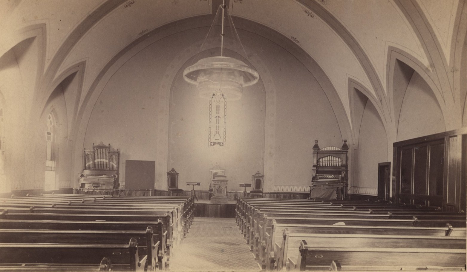 Sanctuary of the Unitarian Church on Glendon St. Dedicated Jan. 17, 1888. At the left and right front are two large reed organs with display (non-functional) pipes above their keyboards. At the time, the Unitarian Church was the most elegant house of worship in wolfeboro. Later, it was the Masonic Temple, now the Village Players Theater.