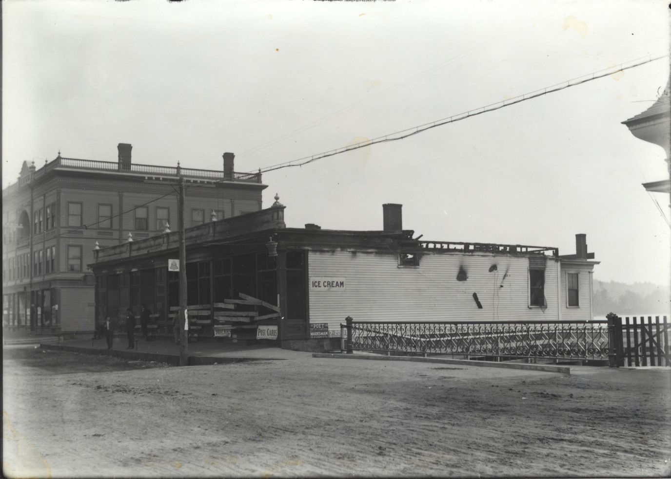 After the original elegant 3-story Goodwin Block building was destroyed by fire on May 28, 1899, a 1-story clapboard building was built on the site that same year. This photo shows the results of a fire on October 13, 1908. The building had 4 businesses, all ruined, L-R, C. H. Johnson (dry goods), Sylvester A. Edgerly (shoes), F. T. Morrill (restaurant), and Wolfeboro Drug Store. In 1909, the structure was rebuilt and opened again, with new tenants.