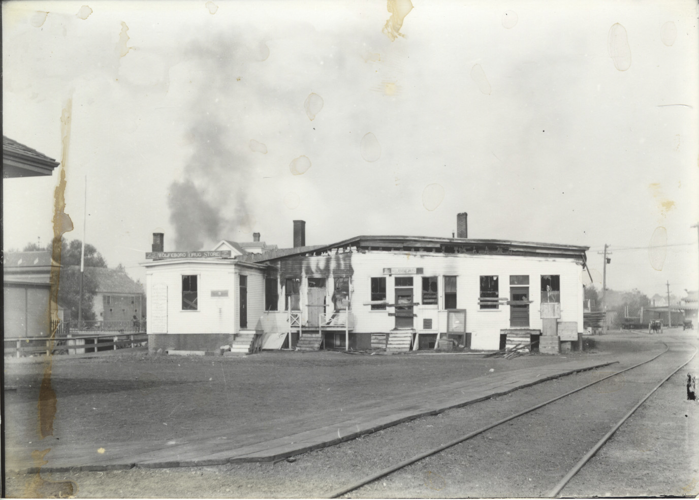 After the original elegant 3-story Goodwin Block building was destroyed by fire on May 28, 1899, a 1-story clapboard building was built on the site that same year. This photo shows the results of a fire on October 13, 1908. The back of the building shows scarred walls and boarded up doors and windows. Note the railroad tracks leading to the dockside wharves. In 1909, the structure was rebuilt and opened again.