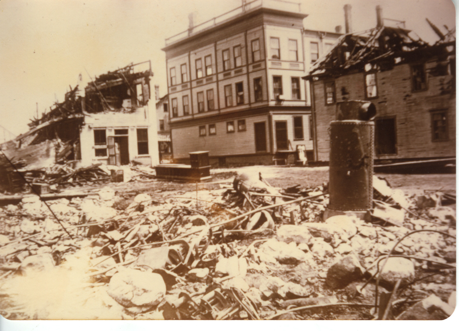 Photo taken from Wharf area looking across the foundation of the Mt. Washington Wharf building at the Goodwin Building ruins. The Peavey Block in the center, now known as the Avery Block, was saved.
