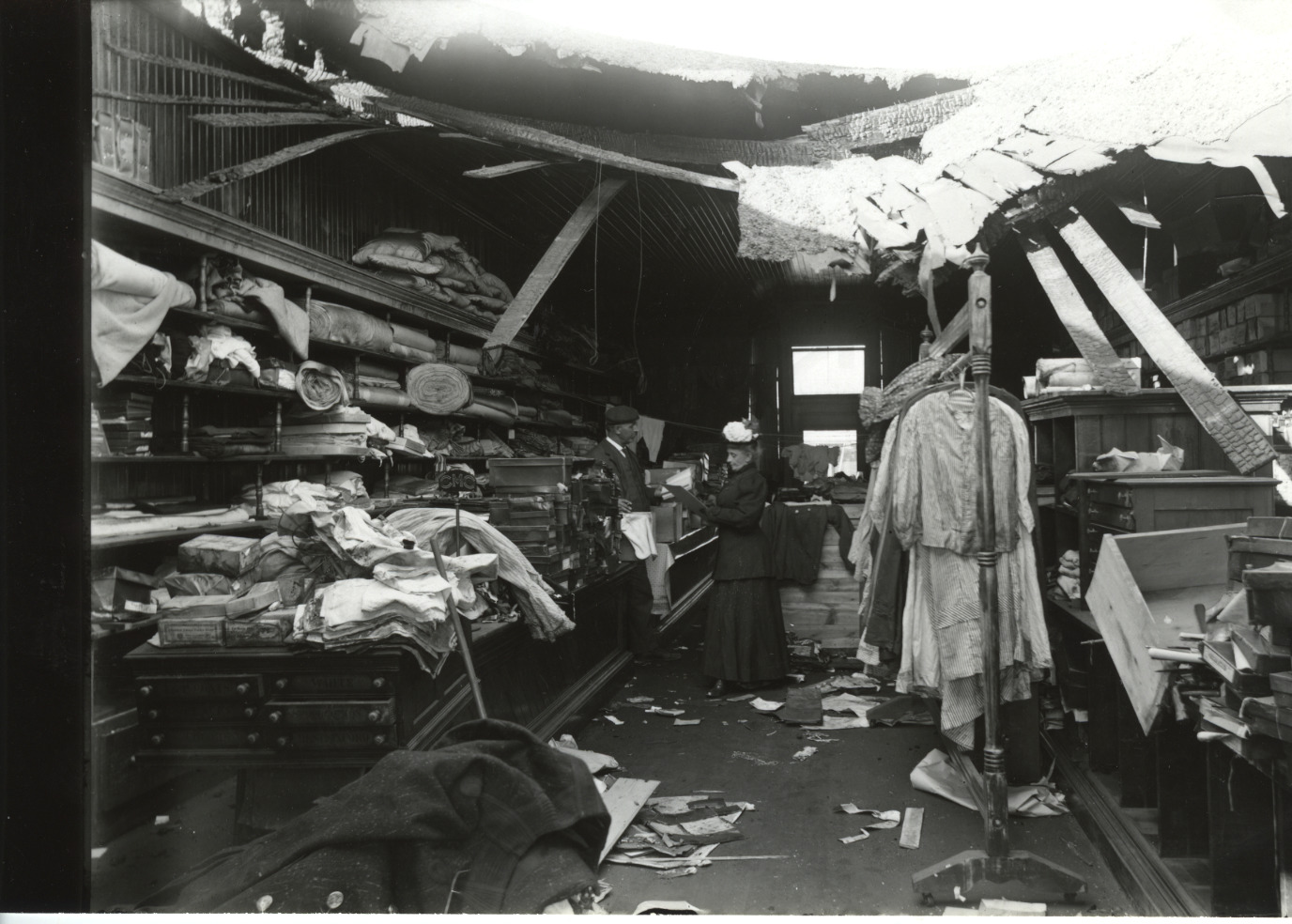 Interior of Johnson's Dry Goods Store after the 1899 fire. Owners Sarah and Charles Johnson at rear counter.