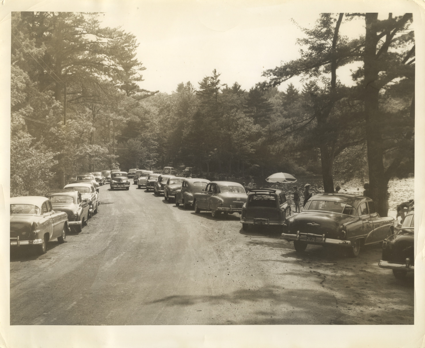 Forest Road by Carry Beach, looking south toward Wolfeboro Neck, 1954. The road is still adjacent to the beach. What a mess. The road was finally relocated in 1966.