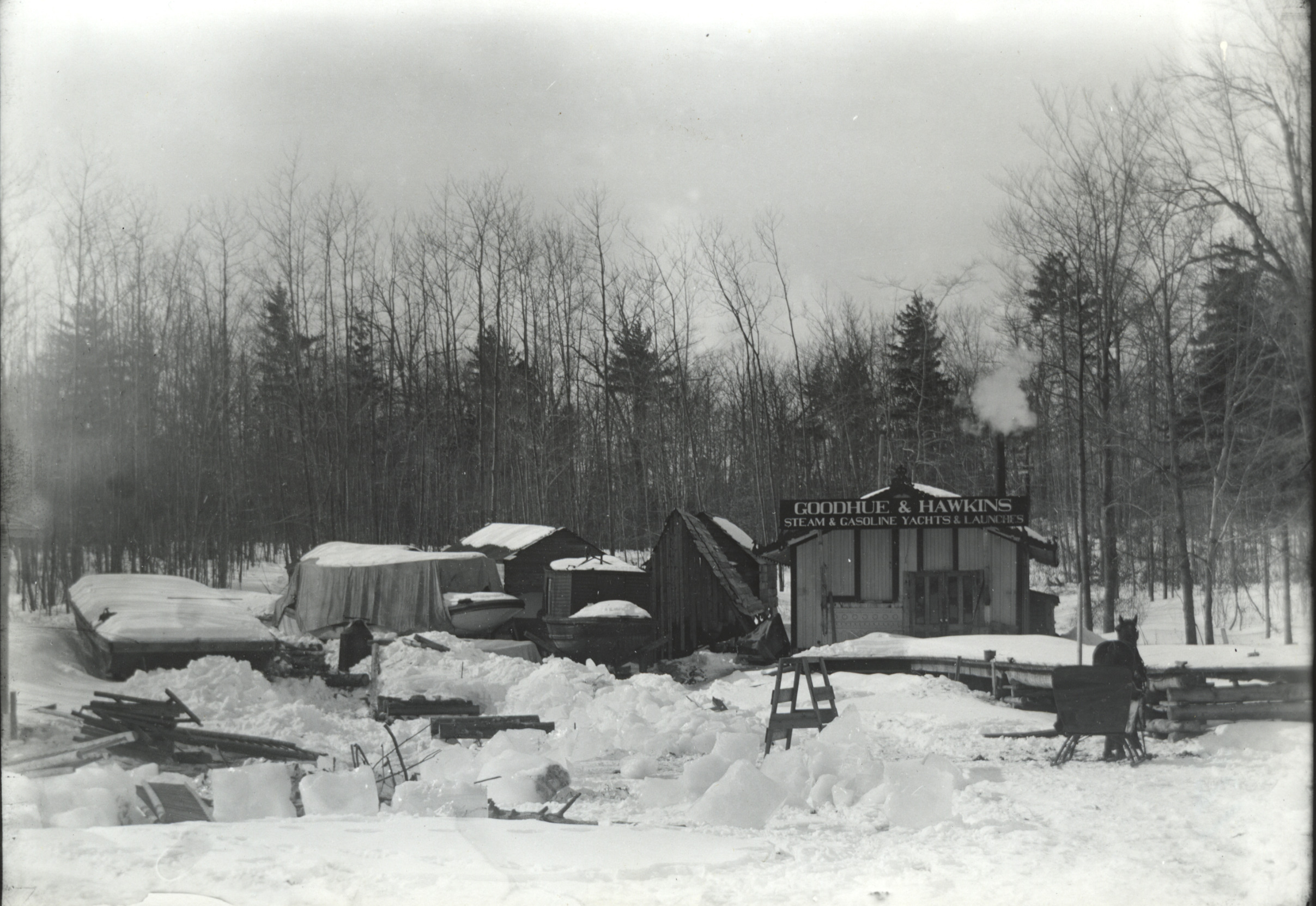 Goodhue and Hawkins Navy Yard on Sewall Road, March 7, 1905. Established in 1903, this business has long been the biggest shipyard in Wolfeboro.