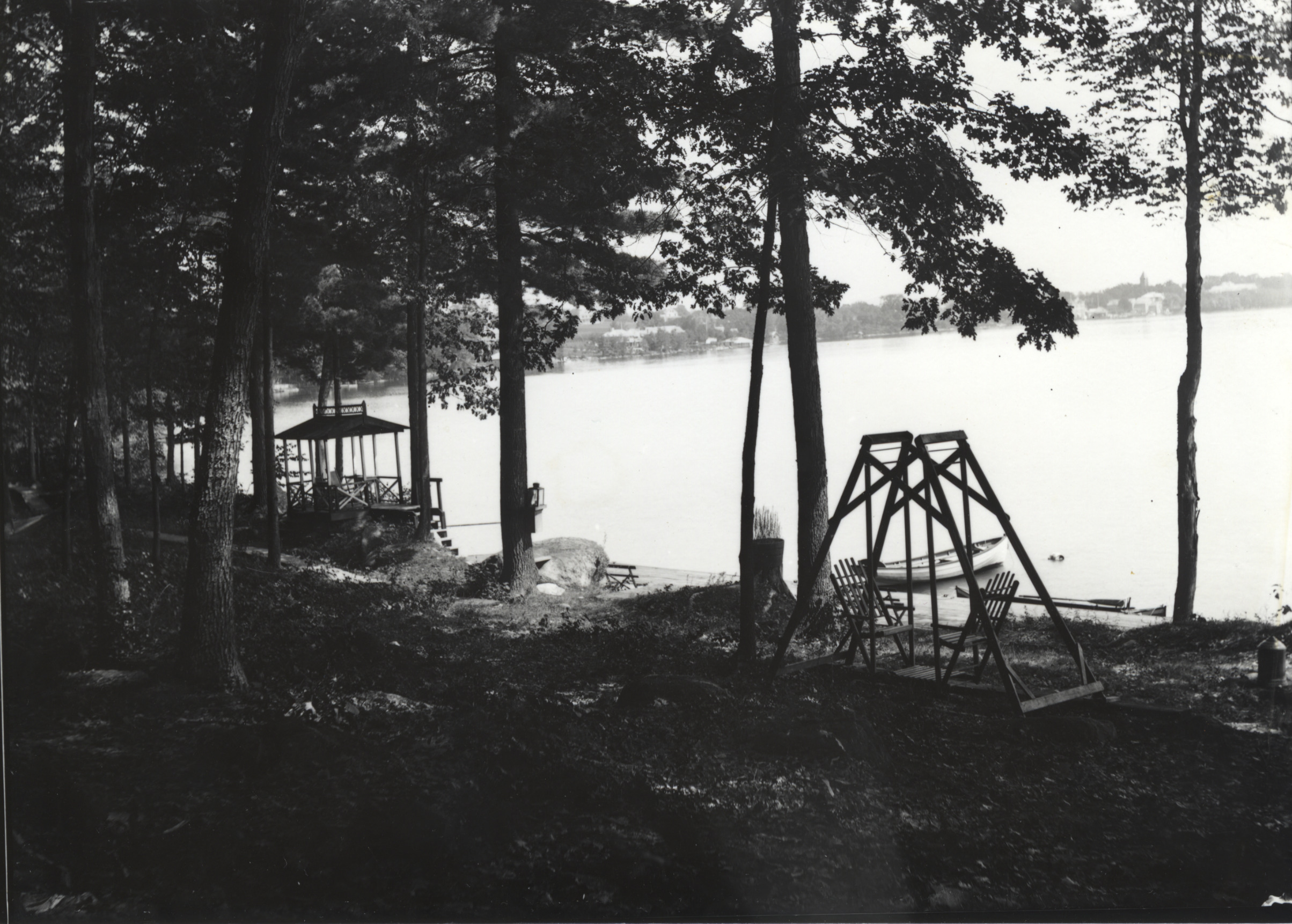 "Ferncliff", first house on Sewall Road, built for Col. Edward B. Dickinson, 1890. Shore front, boat landing and gazebo. Note the old style platform swing set.' Downtown Wolfeboro is in the background; note the tower of Brewster Memorial Hall on the right.
