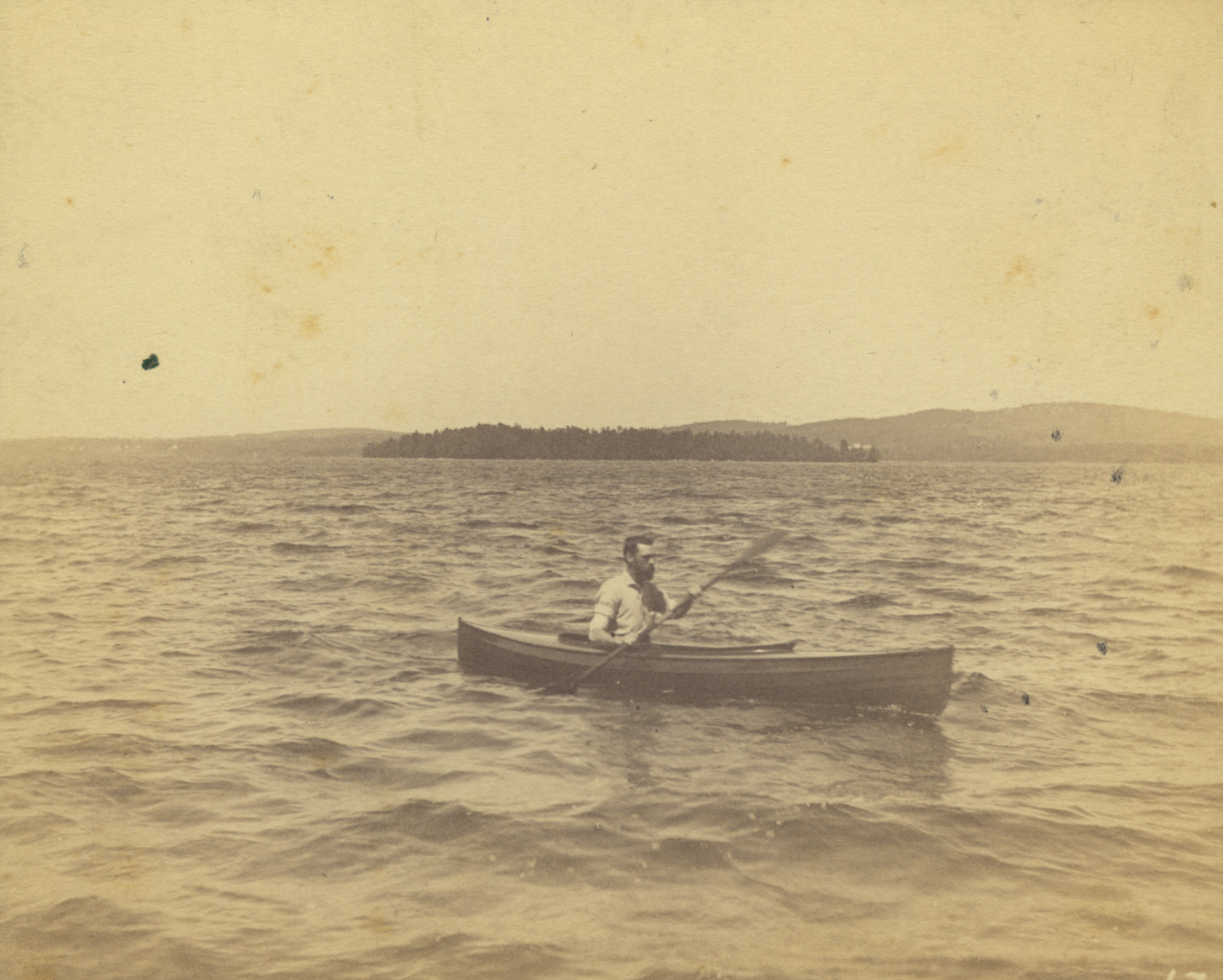Out for a paddle in a wooden kayak named "Adirondak" in front of Lynn Camp, on Governor's Shore, Lake Wentworth, c. 1885. This is near the Governor's Mansion location.