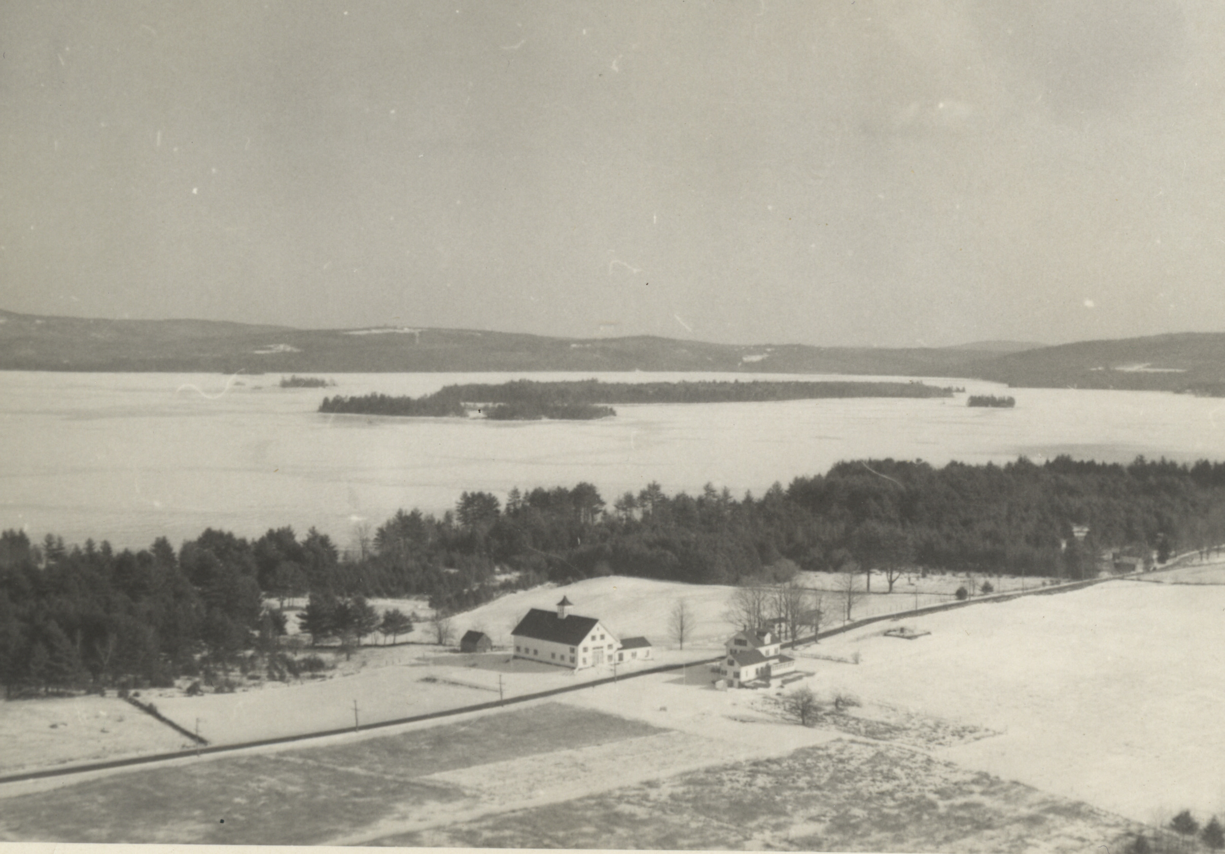 The Whitten Farm at the end of Whitten Neck Rd. is in the foreground, c. 1940. The large island in Lake Wentworth is Stamp Act Island, Bass Island is on the right, and the Seven Sisters Islands are on the left.