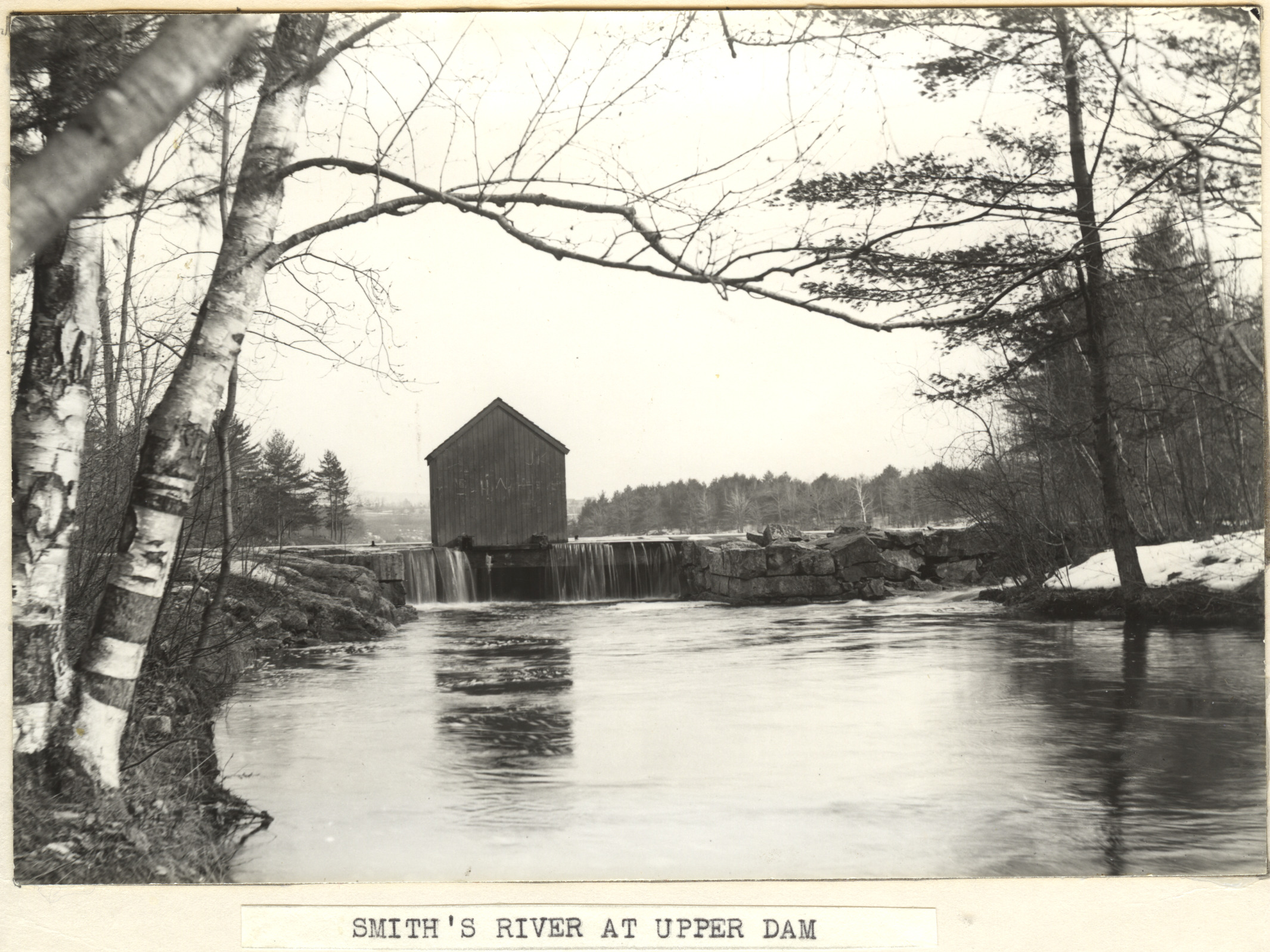 The upper dam and gatehouse on Smith River. The outflow spills from Crescent Lake down to the holding pond next to Center St. This view is with extremely high water level in Crescent Lake.