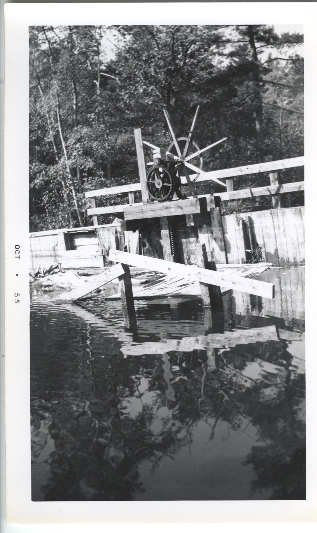 The downstream view of the Crescent Lake dam, 1955. The outflow is the Smith River leading to the holding pond next to Center St. Appears to be in a bit of disrepair.