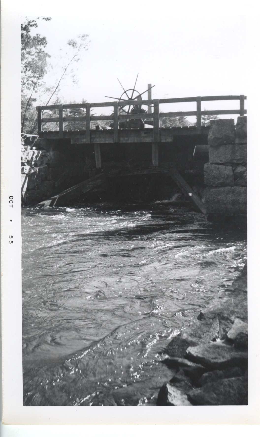 The downstream side of Crescent Lake dam, 1955. The outflow is the Smith River leading to the holding pond next to Center St.