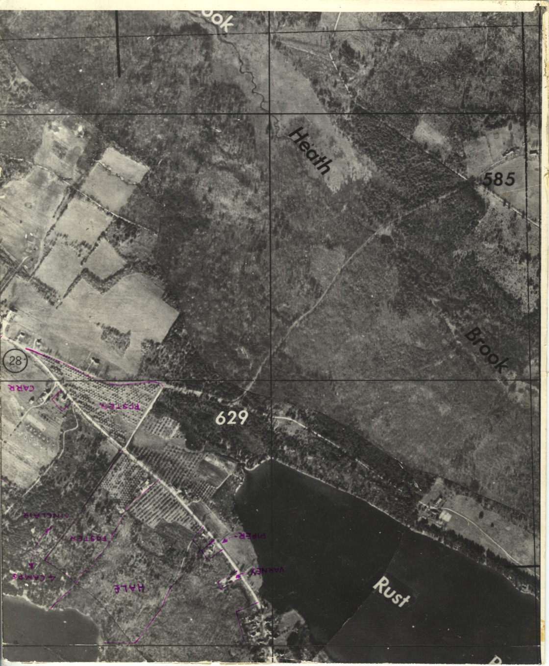 This is the only photo in WHS files showing the extensive orchards operated from about 1920 into the 1950's by Walter Hale and his son Norman, and Roy W. Foster, at the junction of South Main St. and Pleasant Valley Rd. The other road forming the triangle at the left is Cross Rd. Click on the photo twice to enlarge and the neat rows of trees will be obvious. The owners names will be upside down, in purple. If you drive past the area, a few of the old trees can still be seen. (To get out of the enlarged view, first click once on the photo, then click once on the back arrow at the upper left of your screen.)
