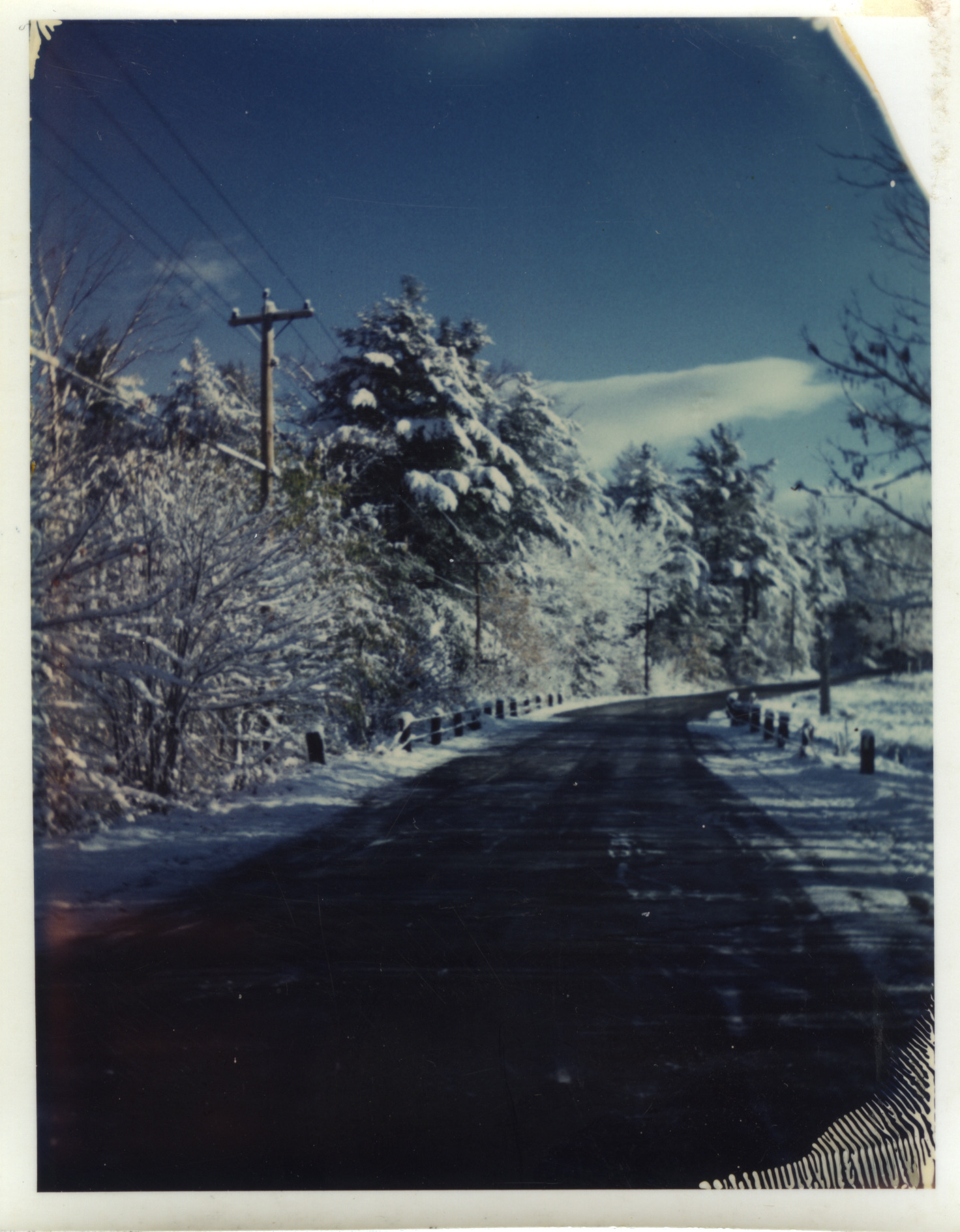 Pleasant Valley Rd. after early 8" snowfall, Oct. 22, 1969. Barriers on bpth sides mark the Heath Brook Bridge, an inlet to Lake Wentworth. Direction is southeast, away from South Main St.