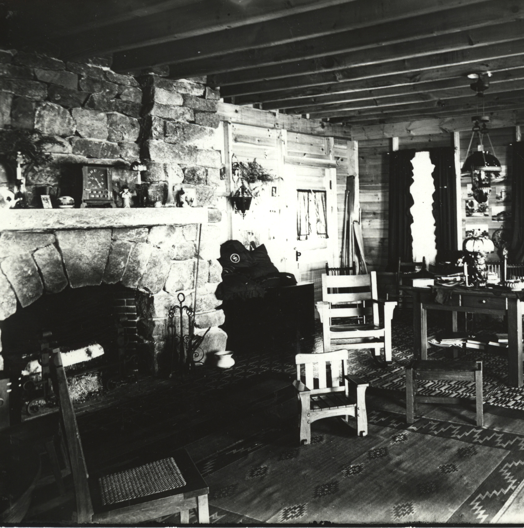 Interior of the Joseph W. Sanford cottage "Minnehaha" on the Townsend Shore of Lake Wentworth, off Pleasant Valley Rd. The stone fireplace was said to be one of the finest in NH. Lighting was by kerosene lamps and candles.