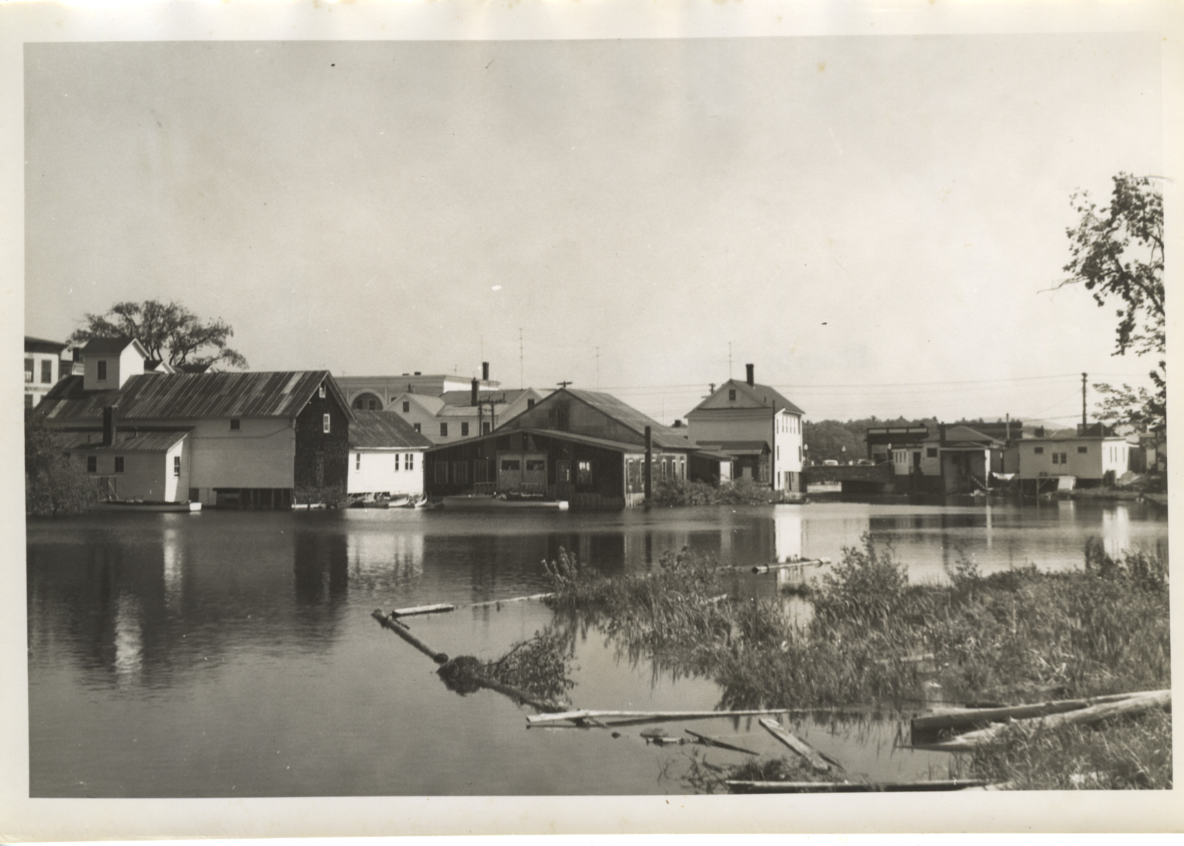 View across Back Bay, from the area of the Clow Sawmill site looking at the buildings on Railroad Ave., c. 1950. The Main St. bridge to Lake Winnipesaukee is toward the right. The Wool Corner building is left of the bridge, the large Avery Block (with arch feature) is in the left-center background.