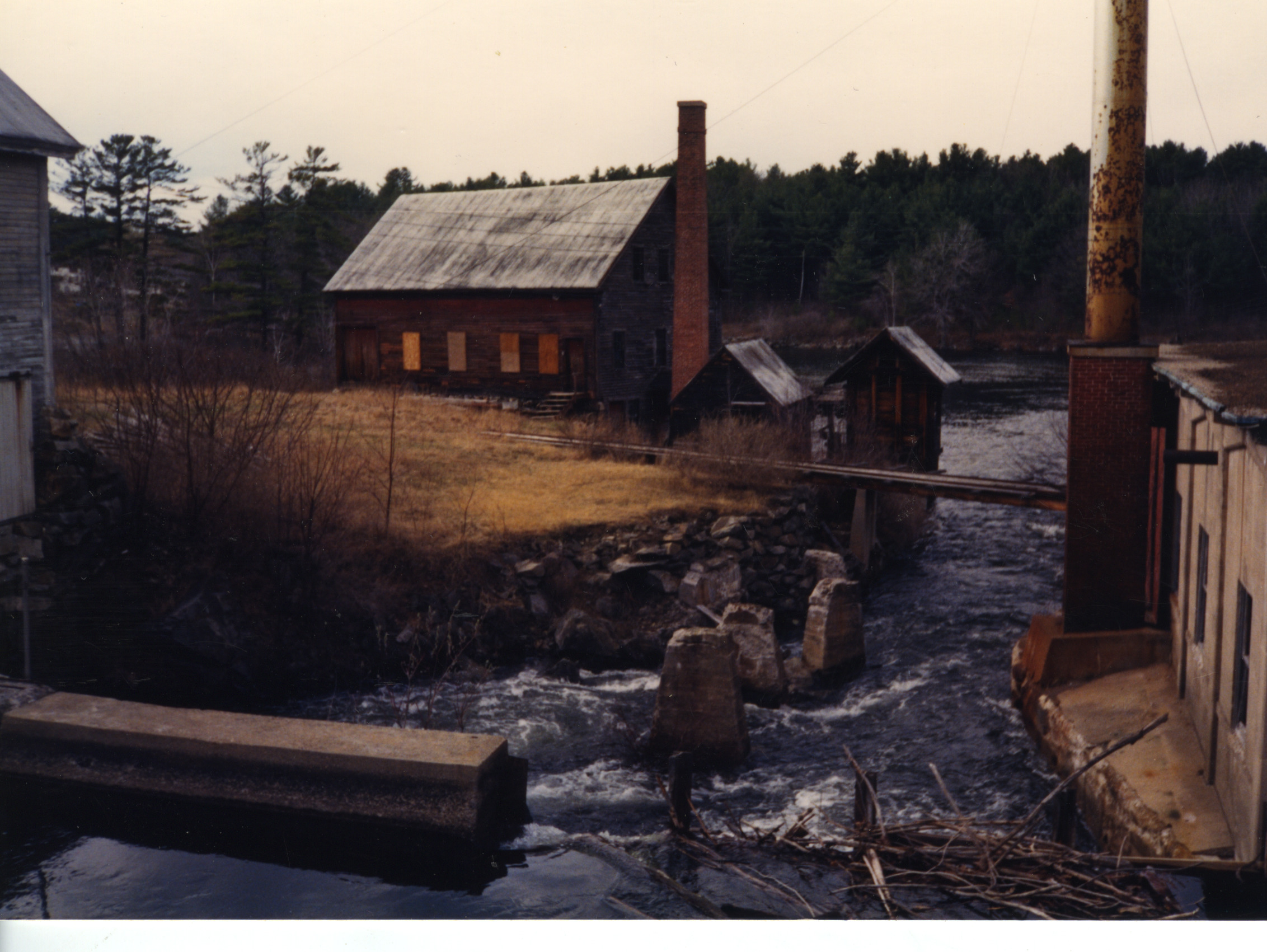 View from the spillway from the Mill Pond on Center St. shows the end of the Smith River as it runs into Back Bay. Taken April 22, 1989. Buildings were part of the Berry Excelsior Mill and Machine shop, last used in 1976.