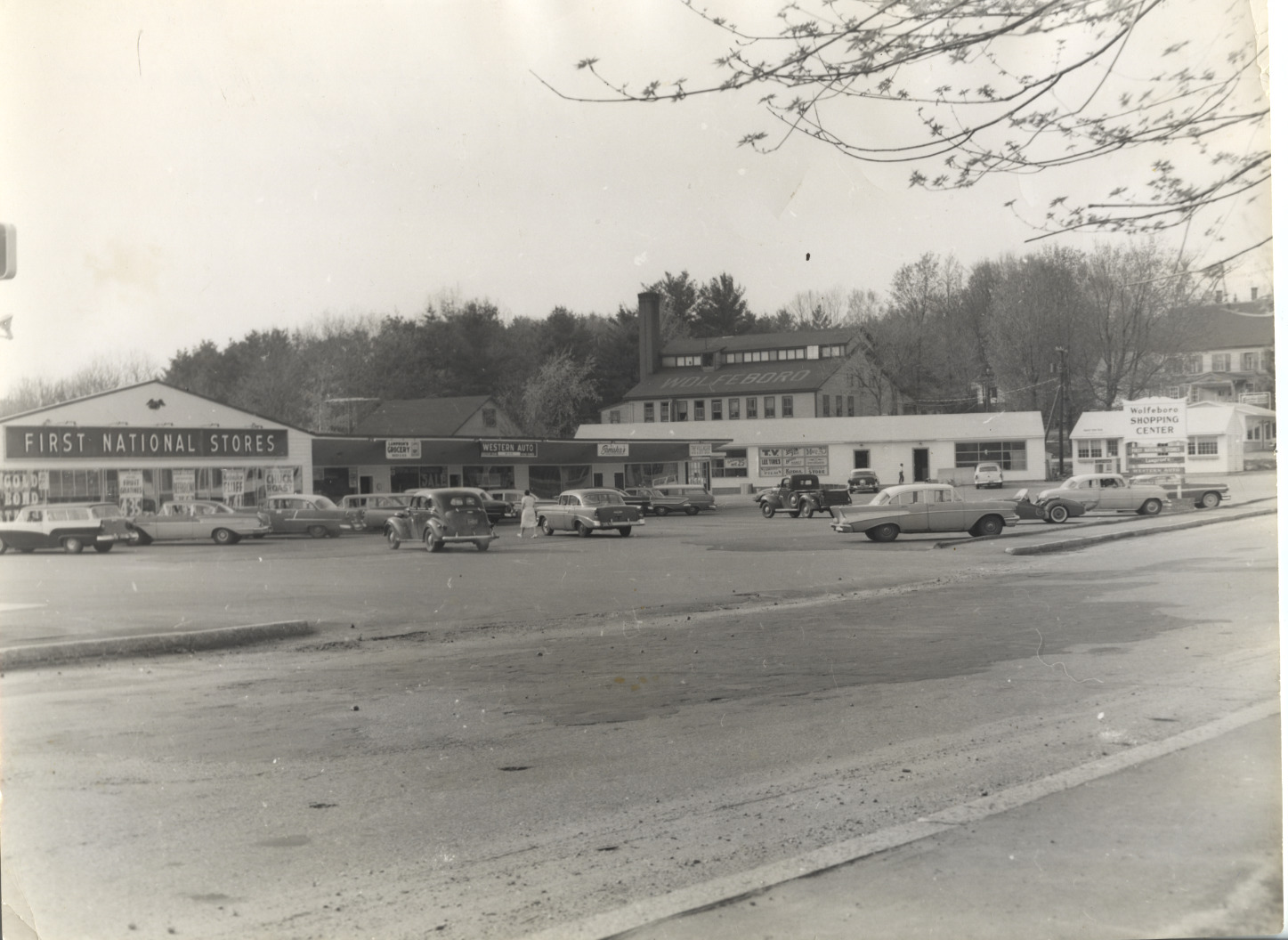 Wolfeboro Shopping Center on Center St., now known as Clarke Plaza, c. 1960's. The supermarket is now Harvest Market. All other stores have also changed.