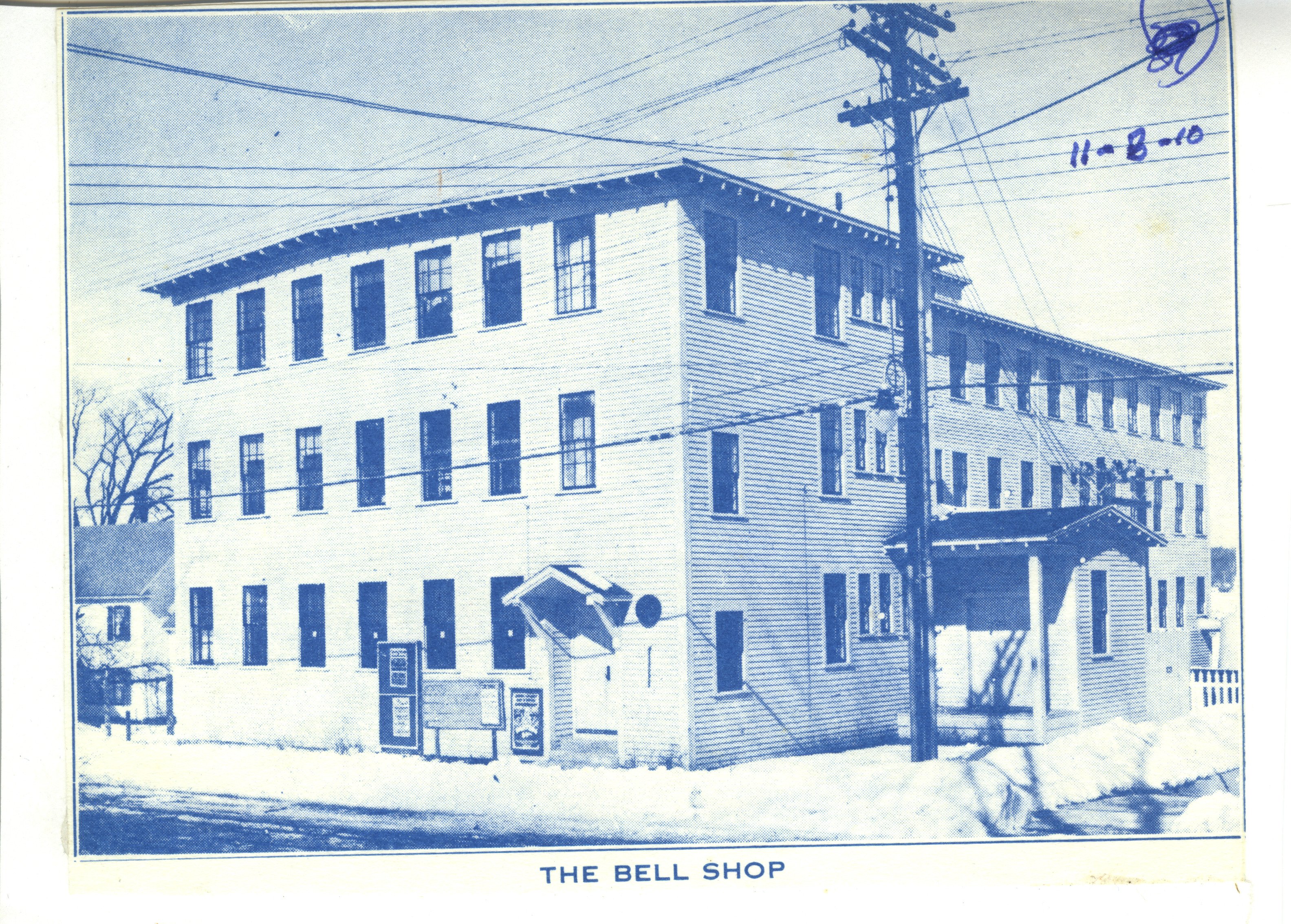 This is known as the Bell Shop, c. 1930. Its history is quite a tale. The first building on this site was a huge 4-story known as the Shoe Factory or the Big Shop, 200 feet long by 36 feet deep with 2 ells, 36 x 75 feet; built in 1884, burned down in 1887, then rebuilt the same year in the same size. Owned by the Town in the hopes of attracting business, it was continually controversial and a burden. In 1911, it was torn down to make way for the power station, except for a section of the west wing, which was reduced to 2 stories. The west wing, shown in this photo, was a shoe factory used by the Bell Brothers from 1923-1938, hence the name Bell Shop. The third story was added in 1925. The building stands today at 16-18 Lehner St.