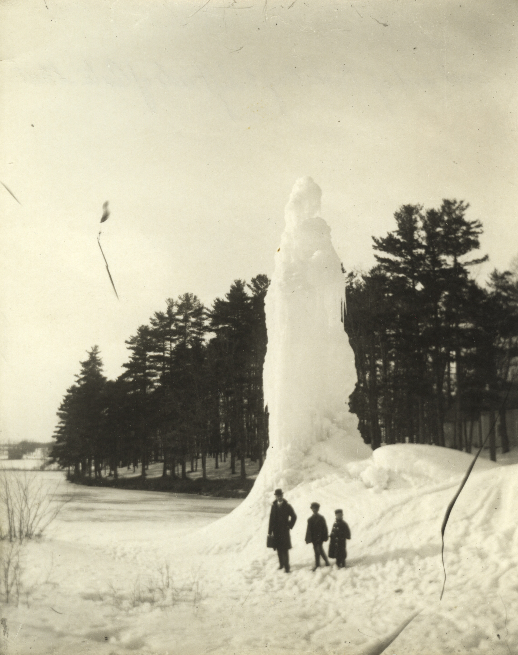 Ice formation produced by an open vent in the water line system. Two of these occurred, one in South Wolfeboro and this one in the Wolfeboro Falls dump area, near the site of the present bank in Clarke Plaza.