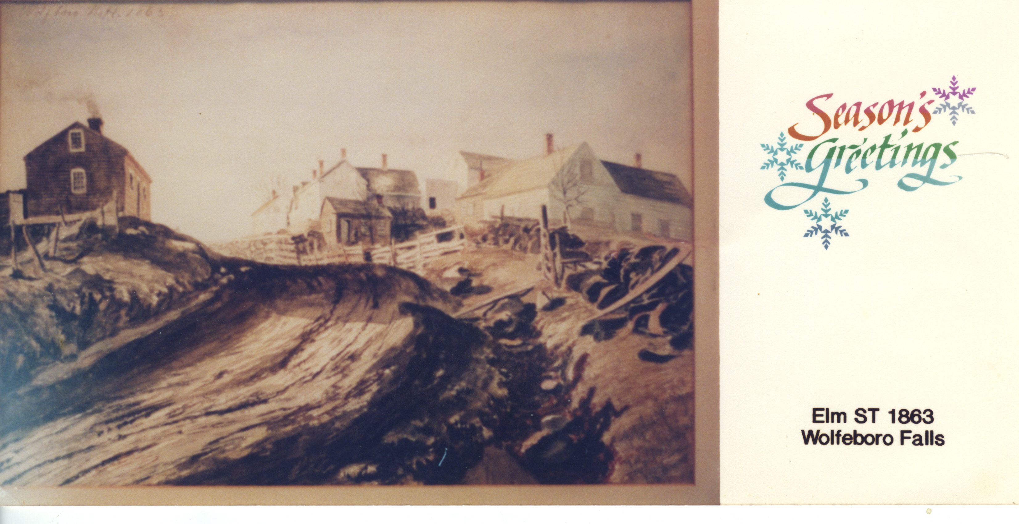 Greeting card of Elm St. in Wolfeboro Falls, depicting its condition in 1863.